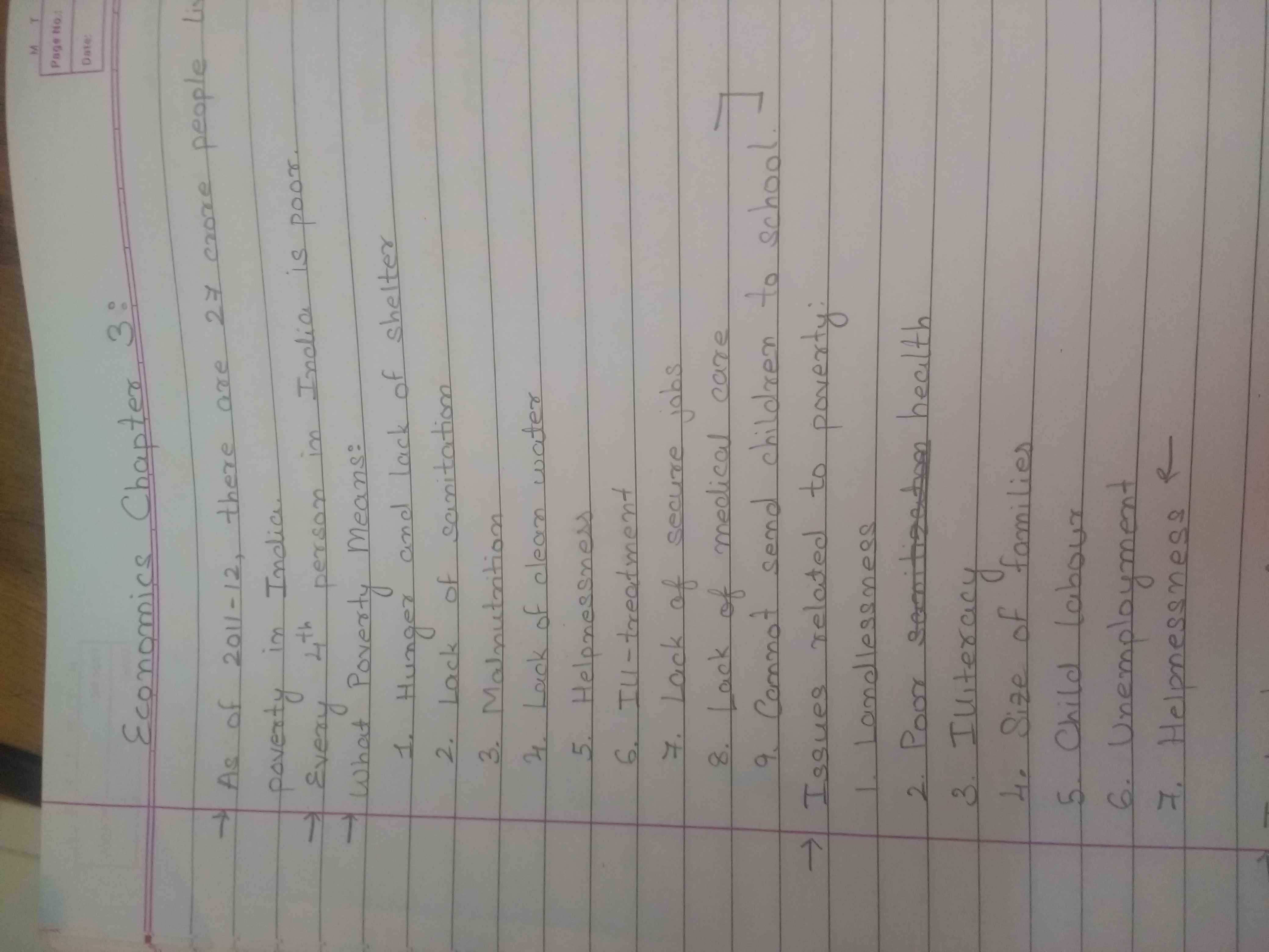 The handwriting presents a neatly organized, upright style, as exemplified in phrases like "Economics Chapter 3" and numbered lists of "What Poverty Means." The letterforms are generally rounded and evenly spaced, indicating a measured and deliberate approach to writing. The writing adheres closely to the lines on the page, suggesting a controlled and disciplined hand. The consistency in letter size and slant throughout the sample enhances legibility, making the text easy to read and understand.