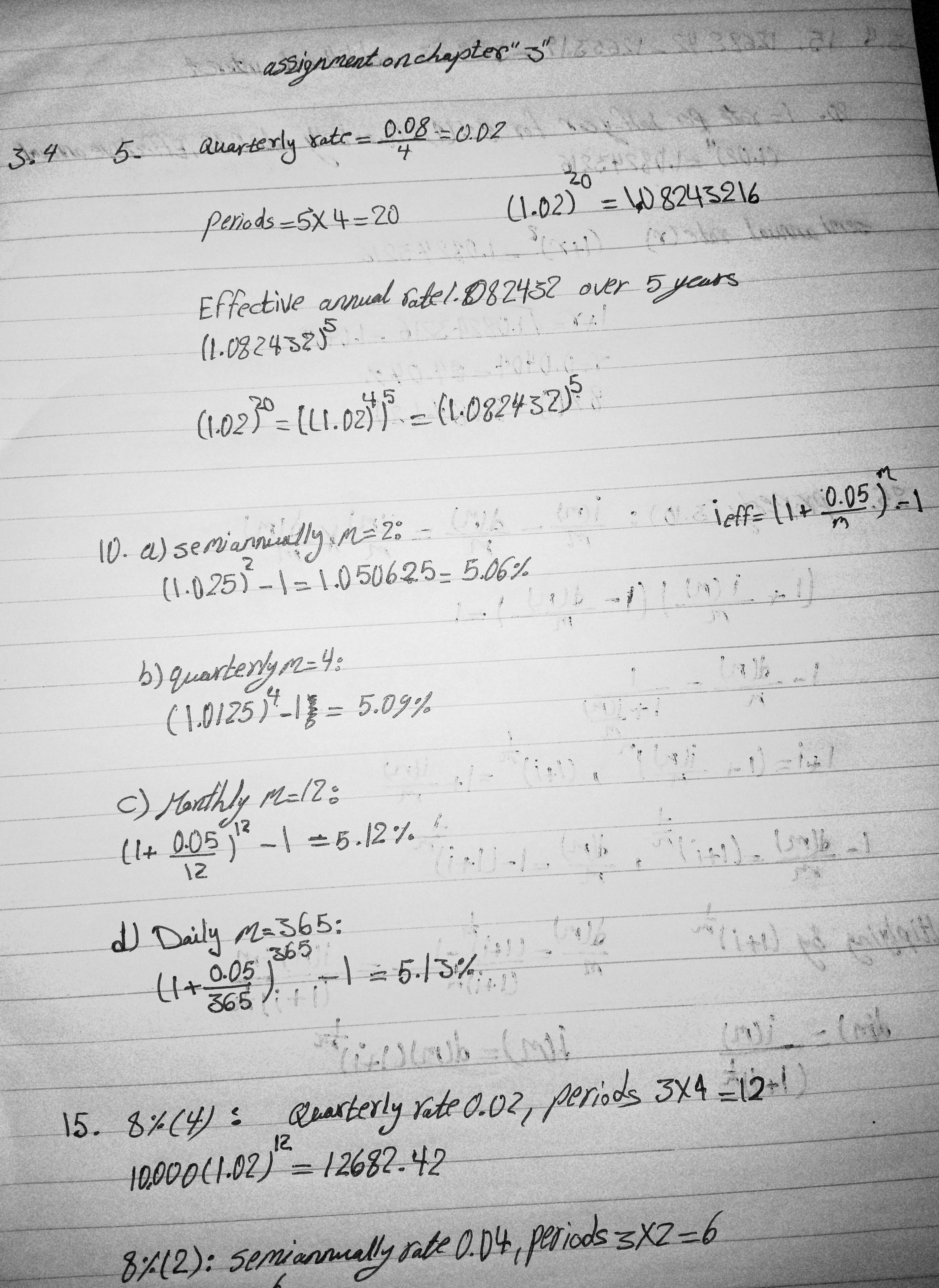 This handwriting style presents a blend of functionality and slight flourish. The letter formation is generally clear, as seen in words like "Quarterly" and "Periods," but there's a tendency for some letters to be slightly cramped or less defined, particularly within the equations. The writing exhibits a moderate slant and a relatively consistent baseline, indicating a good level of control and organization, though perhaps a slight rigidity in overall expression.