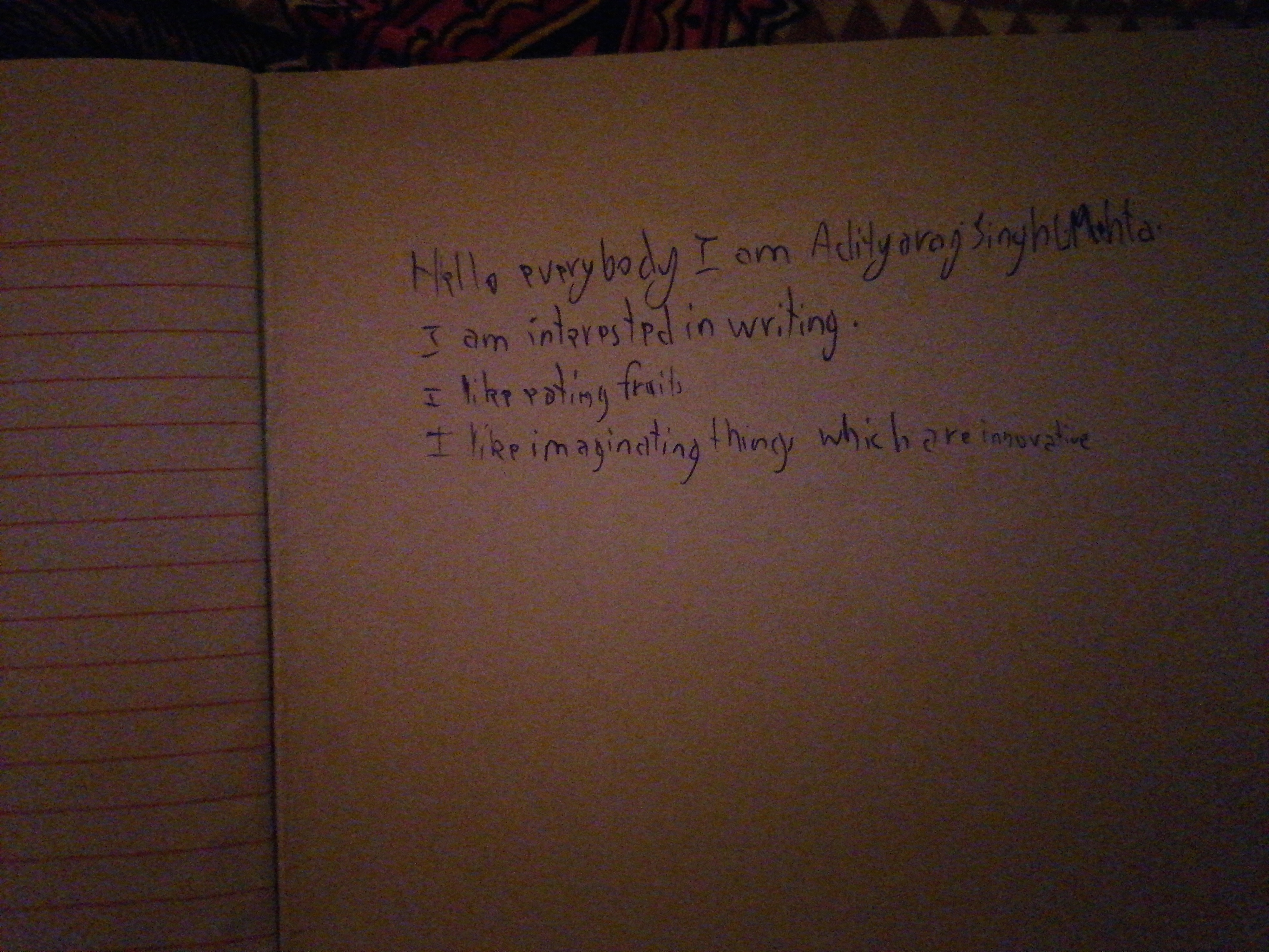 Based on this handwriting, one might infer a personality that is approachable and open-minded, perhaps with a tendency towards creativity and imagination, as indicated by the phrases "interested in writing" and "like imaginating things." The gentle slant suggests a friendly and outgoing nature, while the slight inconsistencies hint at a mind that is sometimes distracted by its own thoughts. There is an obvious enjoyment of learning and a youthful curiosity.
