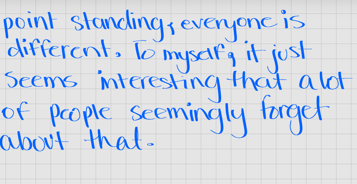 This handwriting showcases a rounded, flowing style with letters that connect smoothly, such as in the words "standing" and "everyone." There's a slight forward slant, and the writing has a moderate pressure, suggesting a balance between assertion and sensitivity. The letter 'g' in 'seemingly' and 'forget' has a distinctive loop, and the overall appearance is neat and quite legible, even if it isn't perfectly consistent.