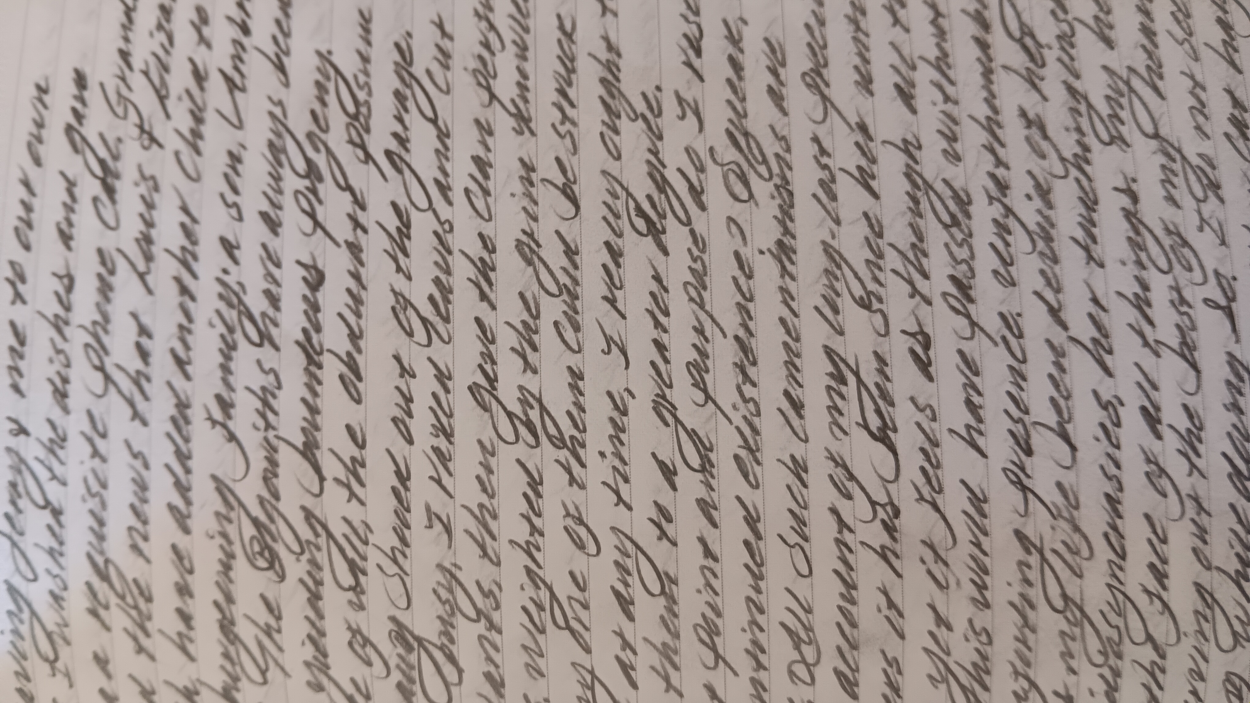 The handwriting presents a captivating, cursive style, where letters gracefully flow into one another. The connections between characters are fluid and 'flourishing,' almost as if the pen danced across the page. Note how the ascenders and descenders have character. The consistency of slant and letter formation contributes to an overall sense of rhythmic elegance. While some words, like 'weighted' or 'obdurate' can appear slightly compressed, the overall impression is one of refined, artistic expression.