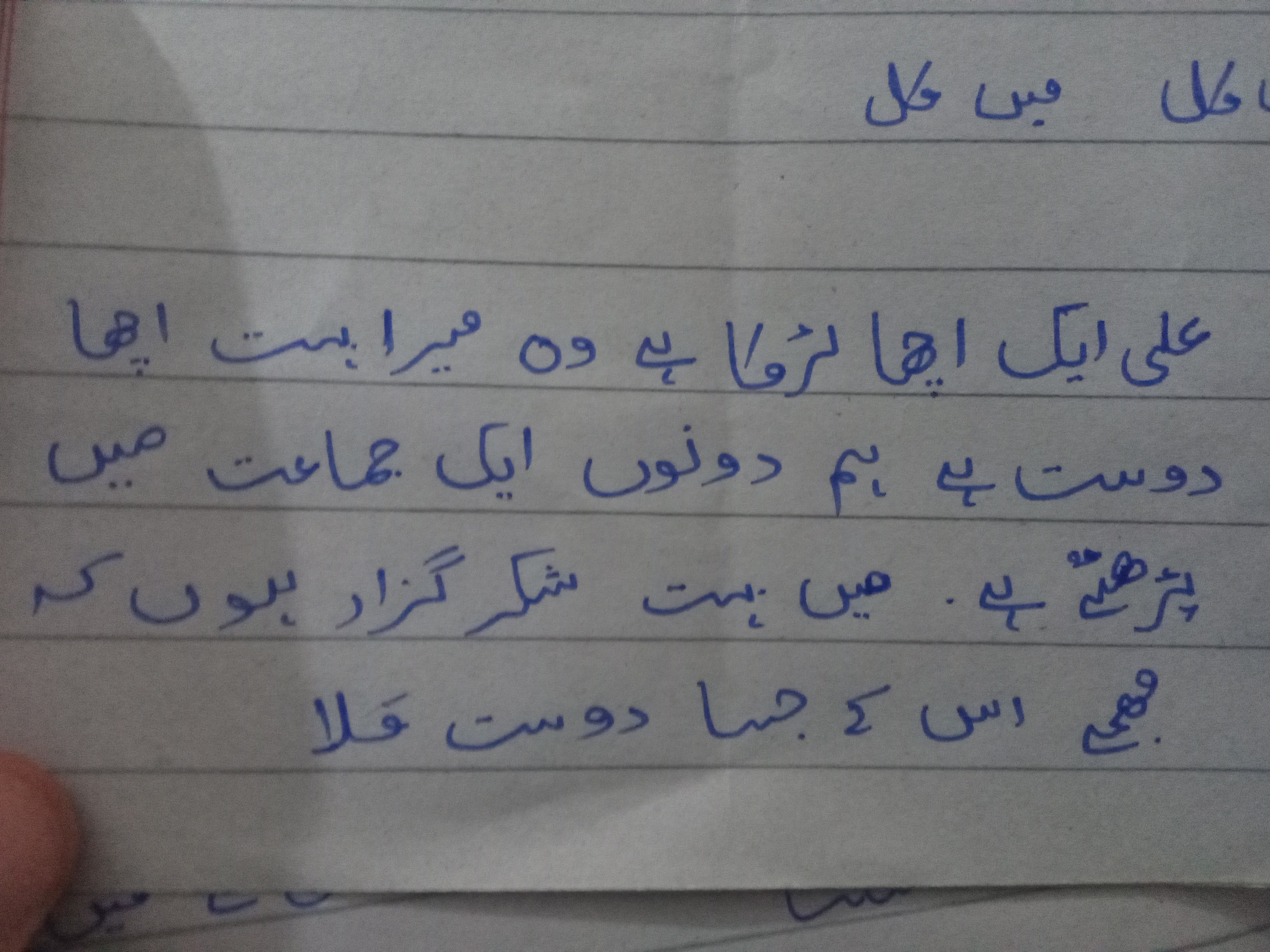 The handwriting exhibits a flowing, rounded style, characterized by gentle curves and consistent spacing between letters. The letters are well-formed, demonstrating a degree of care and attention to detail. The size of the letters is moderate, and the pressure appears consistent throughout the sample, as can be seen in phrases like "میرا بہت اچھا" and "شکریہ ادا". Overall, the writing suggests a deliberate and thoughtful approach.