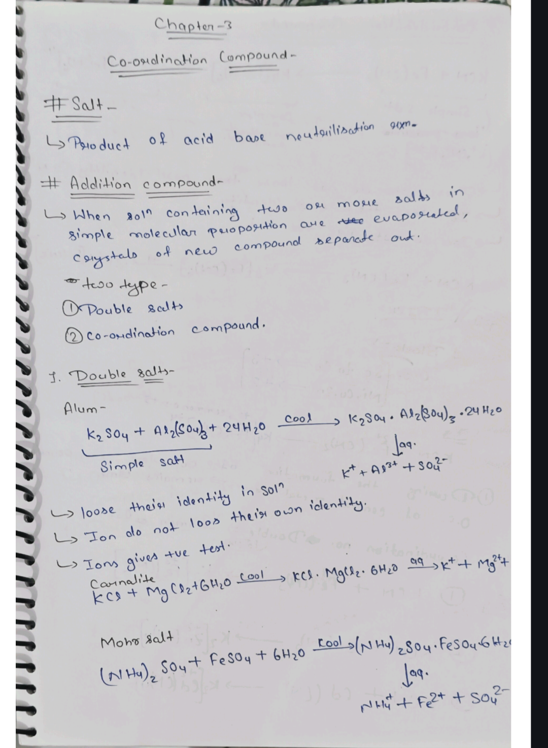 The handwriting presents a mix of meticulous precision and subtle inconsistency. There's an overall impression of carefulness, evident in the deliberate formation of letters, especially in headings like "Chapter-3" and "Co-ordination Compound". The slant is generally upright, suggesting a controlled nature, though there are variations, indicating a flexible approach. The letter size is fairly consistent, reflecting an organized mind. However, some words appear cramped while others are more spaced out, hinting at moments of haste or perhaps a wandering focus. The loops in letters like 'l' and 'h' are moderate, implying a balance between restraint and expressiveness.