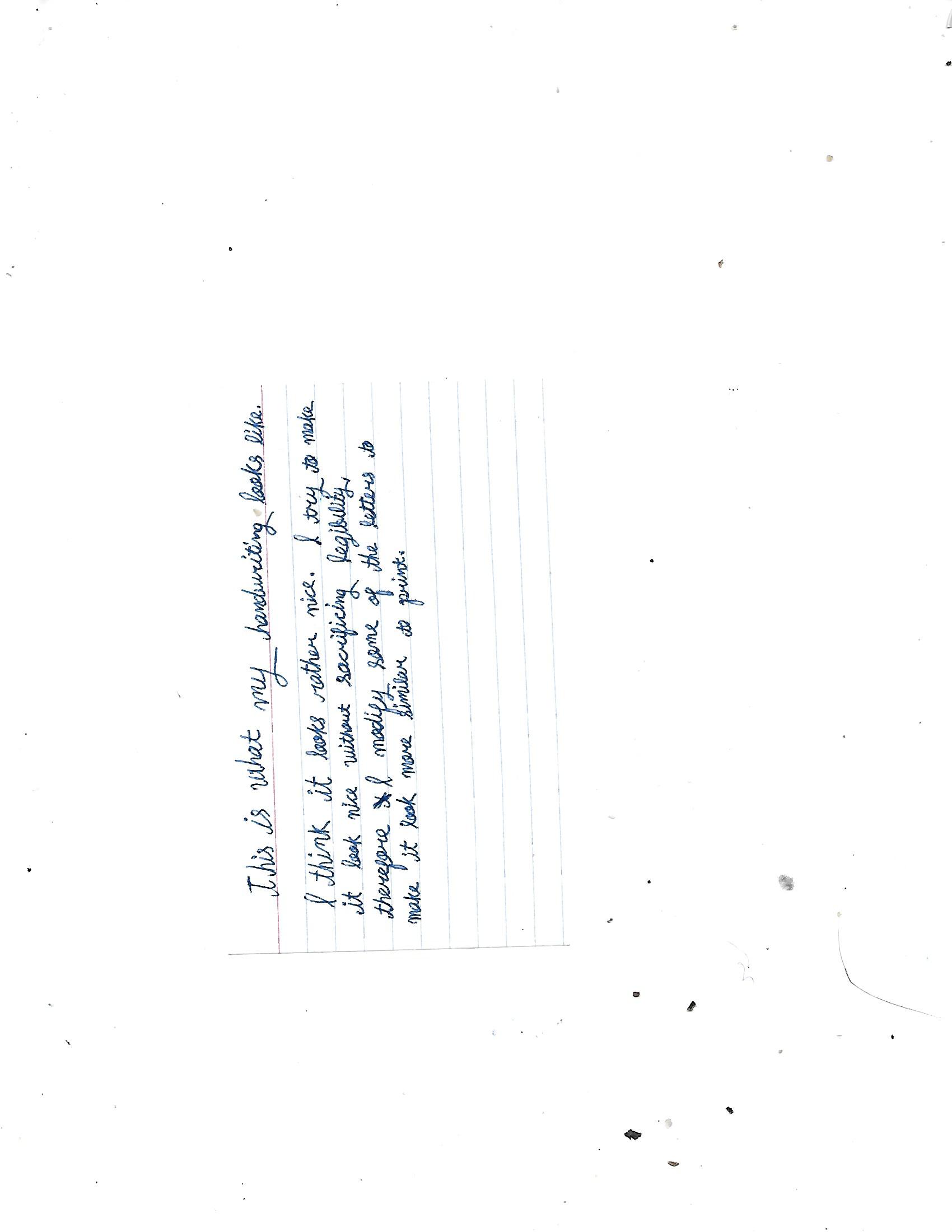 The handwriting is a deliberate attempt to blend cursive with printed forms. There is a conscious effort towards neatness and legibility, as noted in the phrase "without sacrificing legibility". The letter formation is generally rounded, but with occasional sharp angles. The size is relatively uniform, and the spacing between letters and words is consistent. Overall, it suggests a desire for clarity and a certain level of self-awareness regarding the presentation of one's writing.