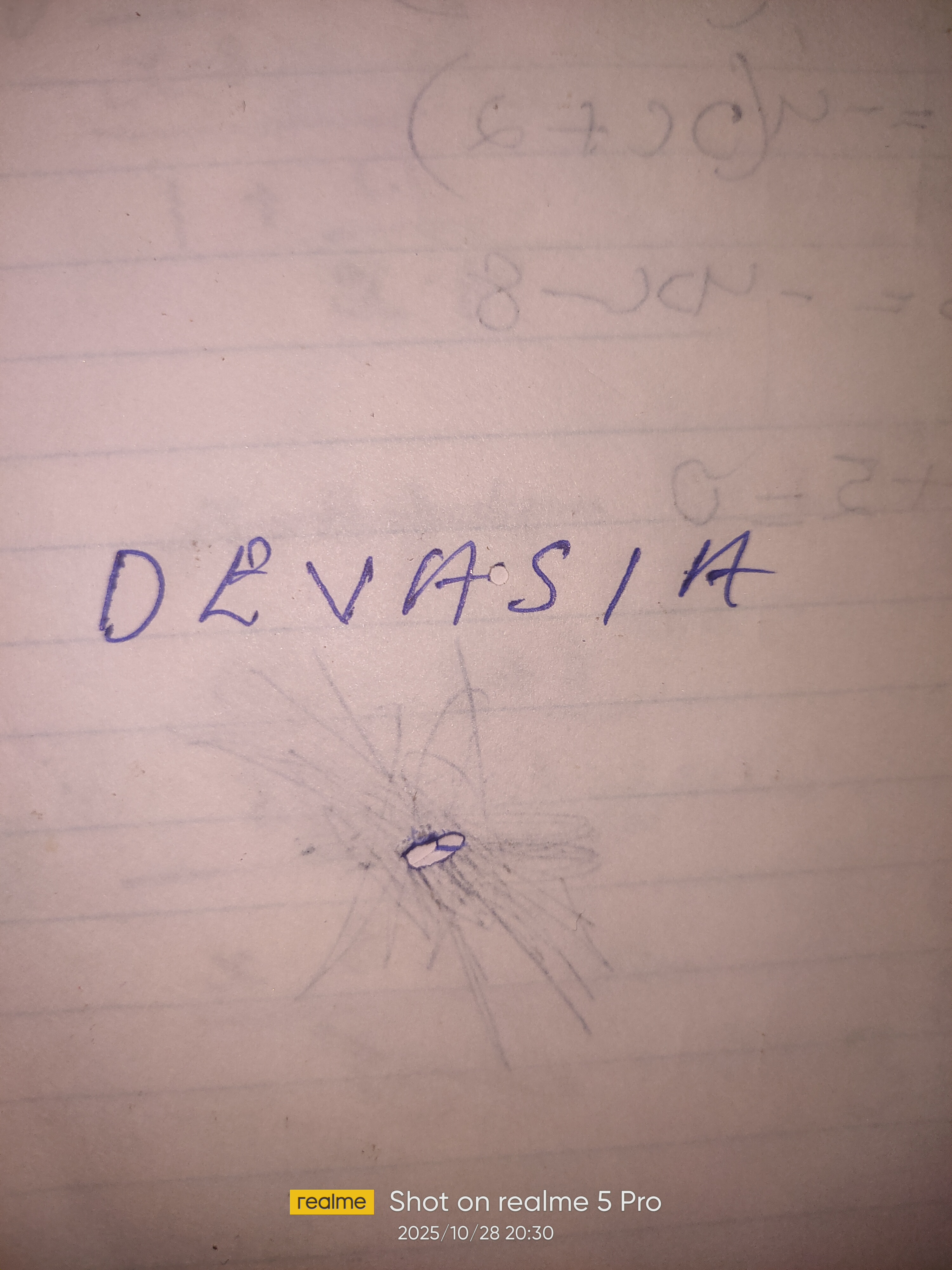 The handwriting style is characterized by its clear, blocky uppercase letters, particularly noticeable in the bold "DEVASIA". Each letter stands distinctly, exhibiting a lack of cursive flow and a deliberate, almost architectural, precision. The writing leans slightly to the right, and there's an attempt at neatness, though some inconsistencies in letter size and spacing are present.