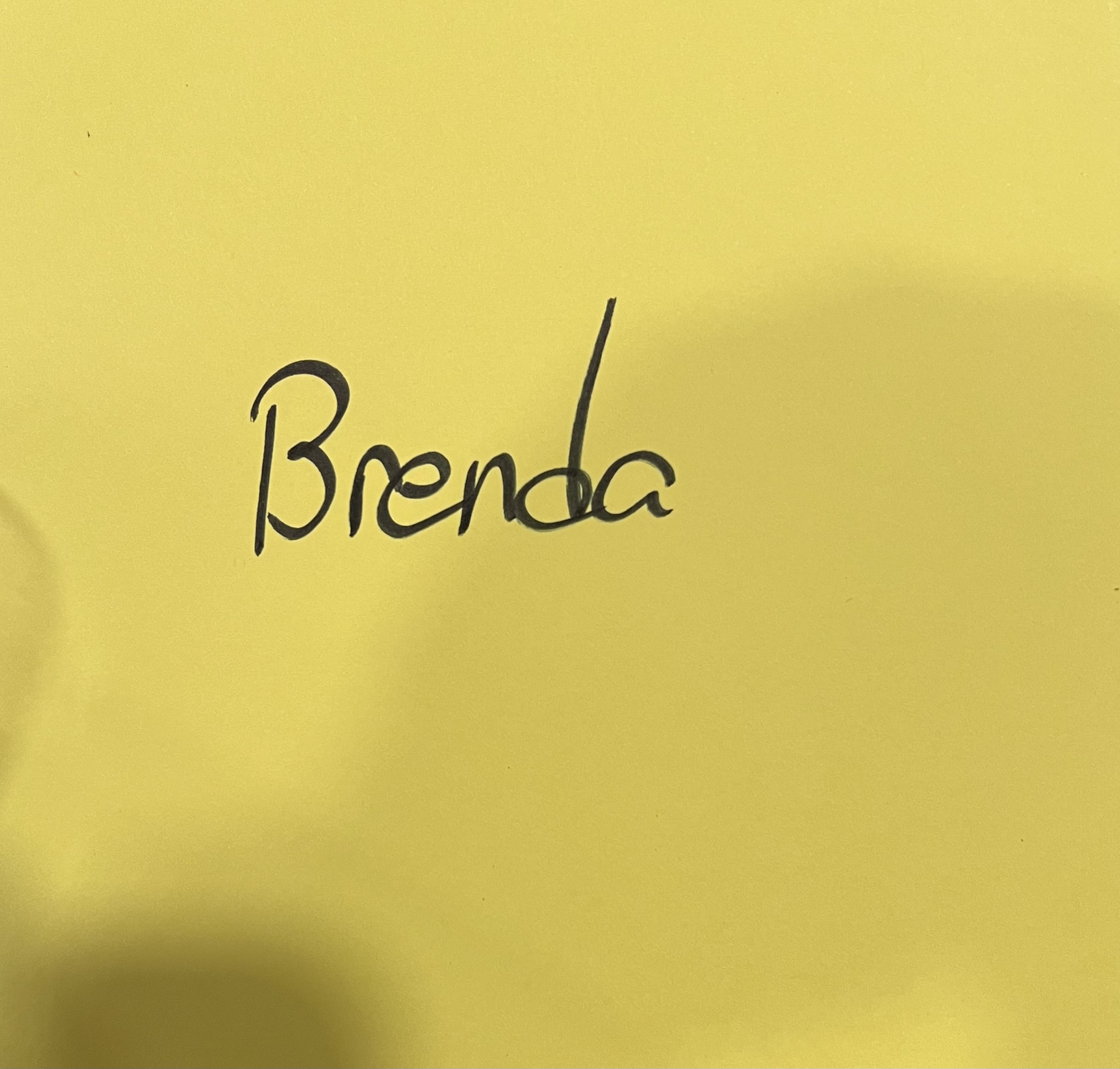 The handwriting presents a fluid, cursive style, with a distinctive looping formation. The 'B' in 'Brenda' showcases a prominent upper loop, which suggests a certain flair and enthusiasm. The overall impression is that the writing leans towards a relaxed and flowing style. There is some inconsistency in the stroke weight, which varies throughout the sample.