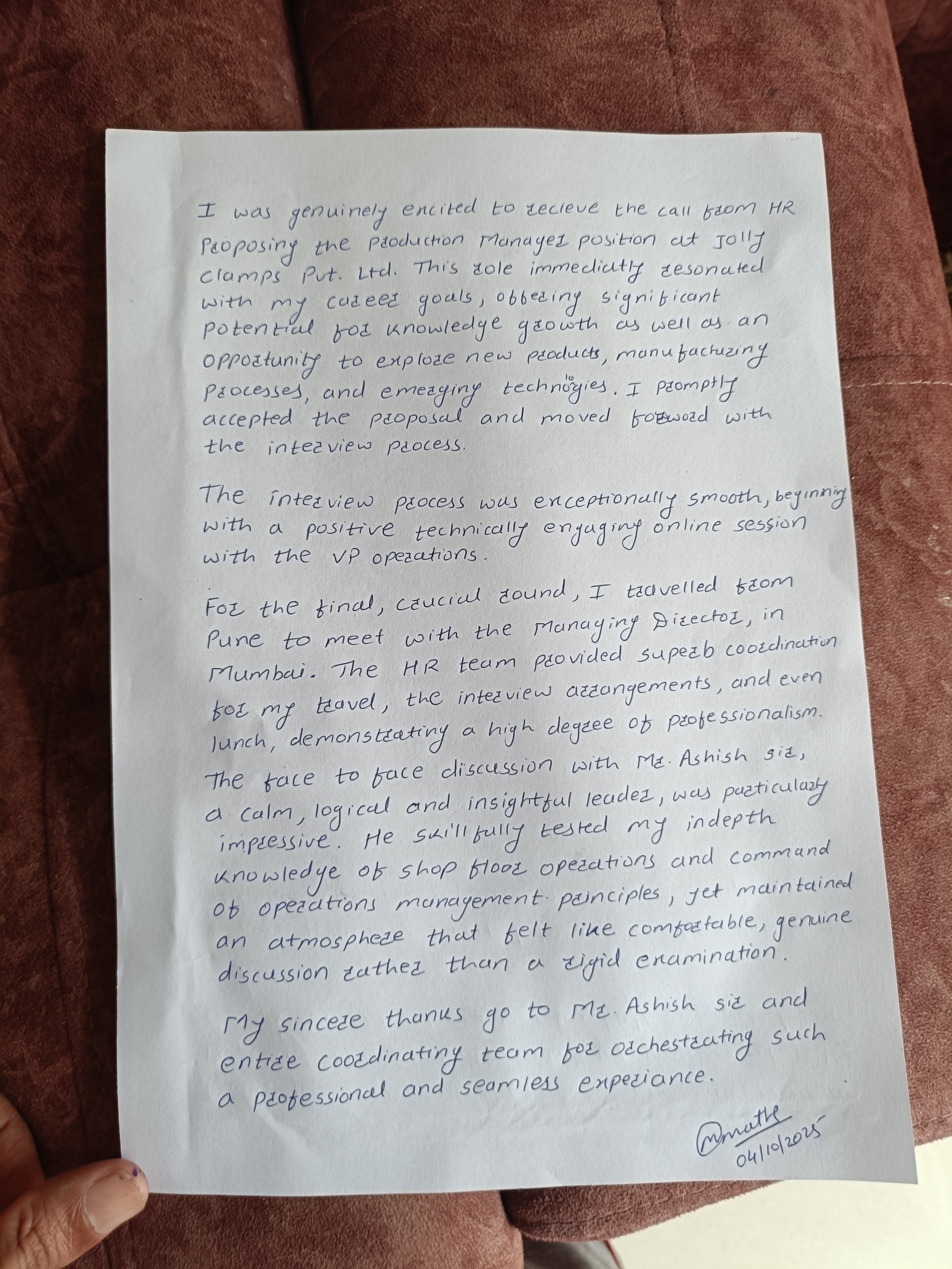 This handwriting reveals a direct and purposeful individual with a good balance of emotional expression and self-discipline, who could benefit from greater consistency in letter spacing and attention to detail.