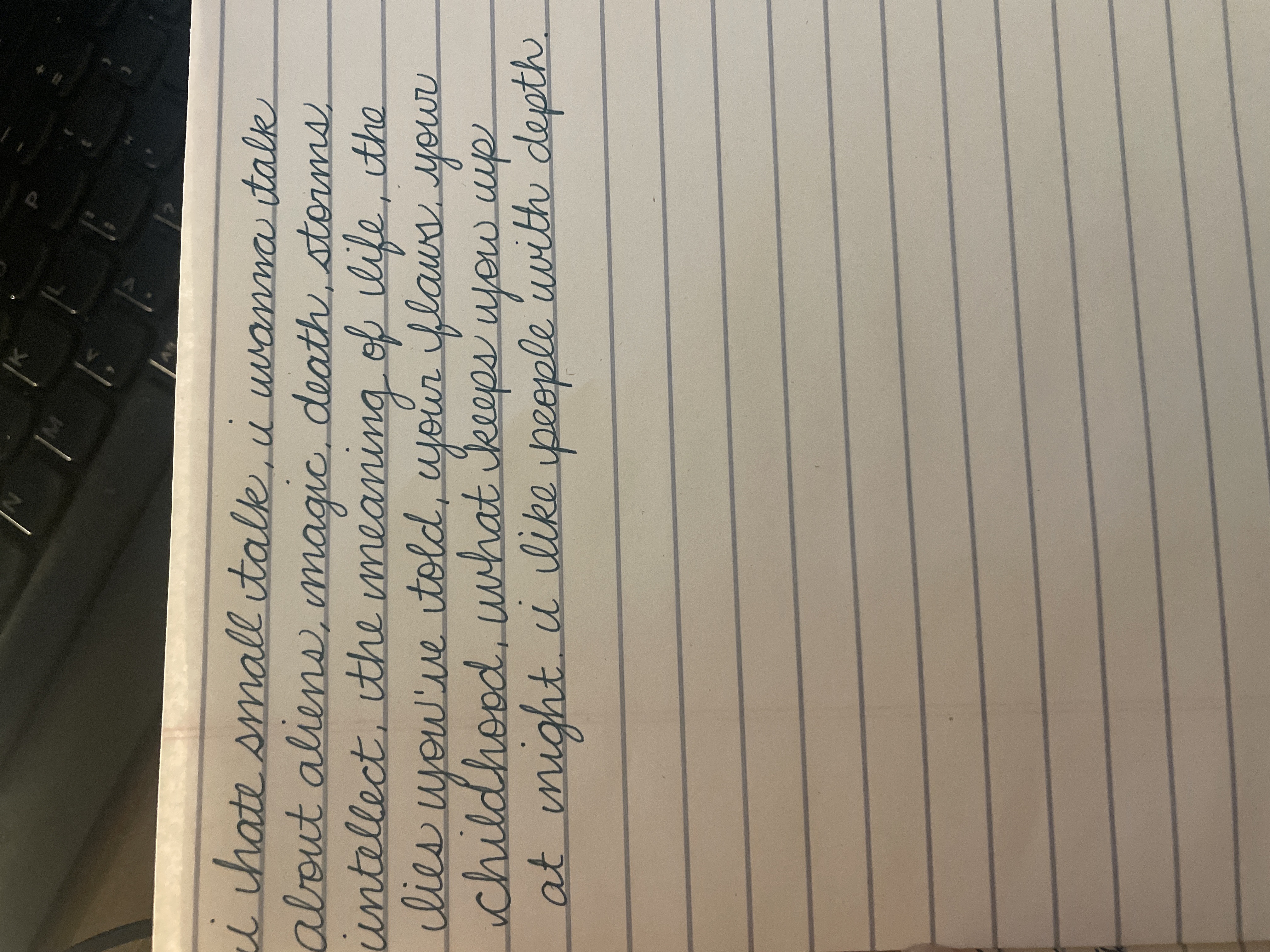 Based on this handwriting, the author may possess a personality that is thoughtful, sensitive, and introspective. The fluidity of the writing suggests a natural ease in communication and a tendency towards emotional expression. The writer is interested in profound topics such as "magic, death, storms" and "the meaning of life", which implies they are deeply interested in life's meaning. The forward slant indicates an outgoing nature and a willingness to engage with others. The consistency in letter formation and spacing reflects a disciplined and organized mind.
