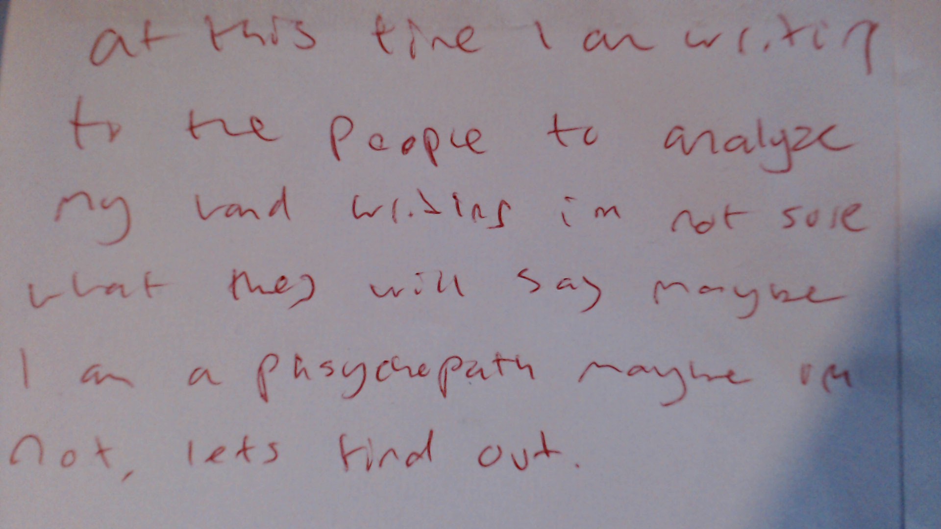 Based on this handwriting, one might infer a personality that is open and perhaps a bit unconventional. The variations suggest a flexible approach to life, and the straightforward letter formations hint at honesty and a lack of pretension. The slightly hurried pace and simple forms could point to someone who values efficiency and directness. The writer may also possess a self-aware and introspective nature, given the content of the sample itself.
