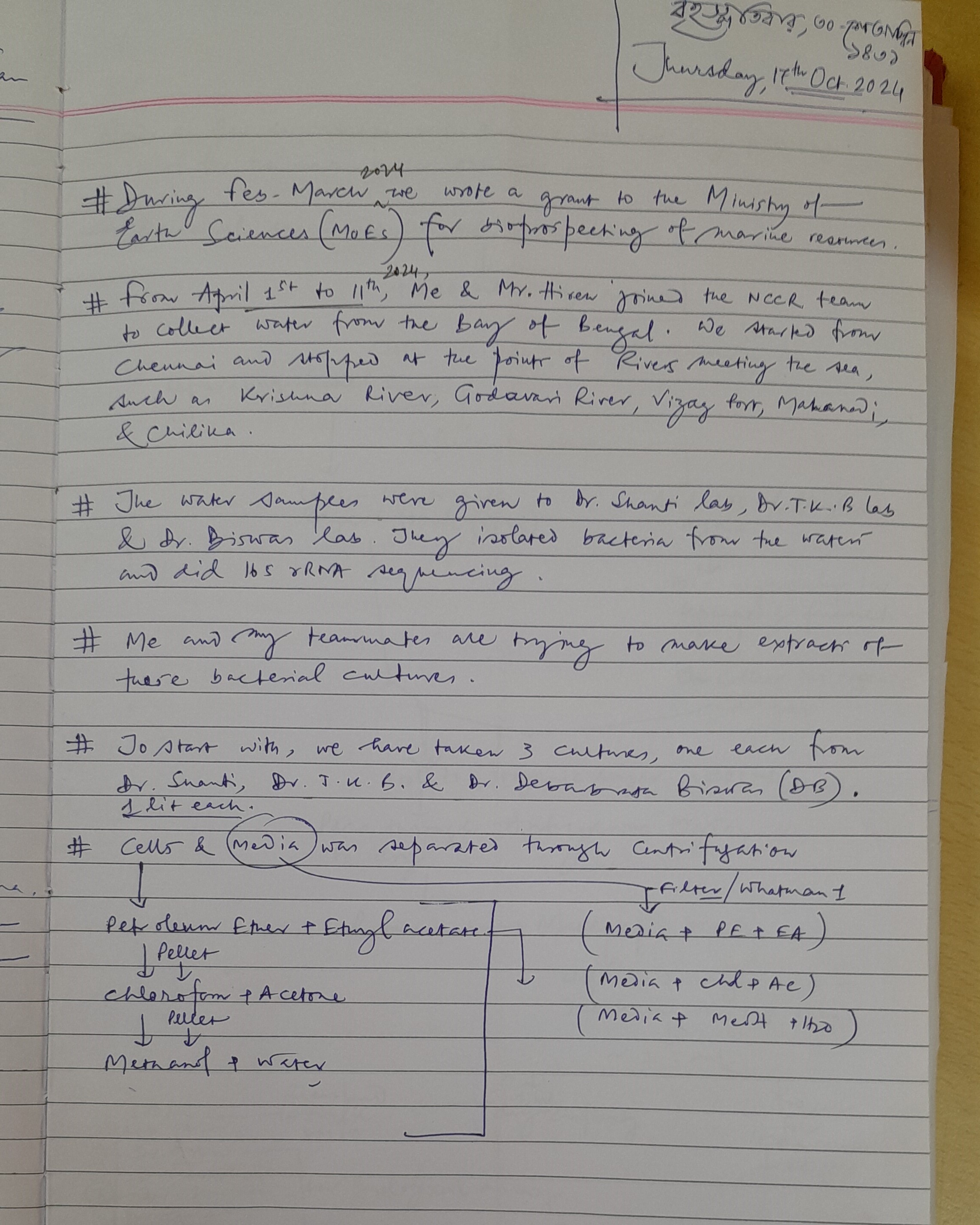 The handwriting is mostly neat and functional, prioritizing legibility over artistic flair. There is a mix of print and cursive, with a slight forward slant. The letter formations are generally clear, although there are some inconsistencies in letter size and spacing, as seen in phrases like "Earth Sciences" and "Bay of Bengal". The pressure appears to be consistent, indicating a steady hand.