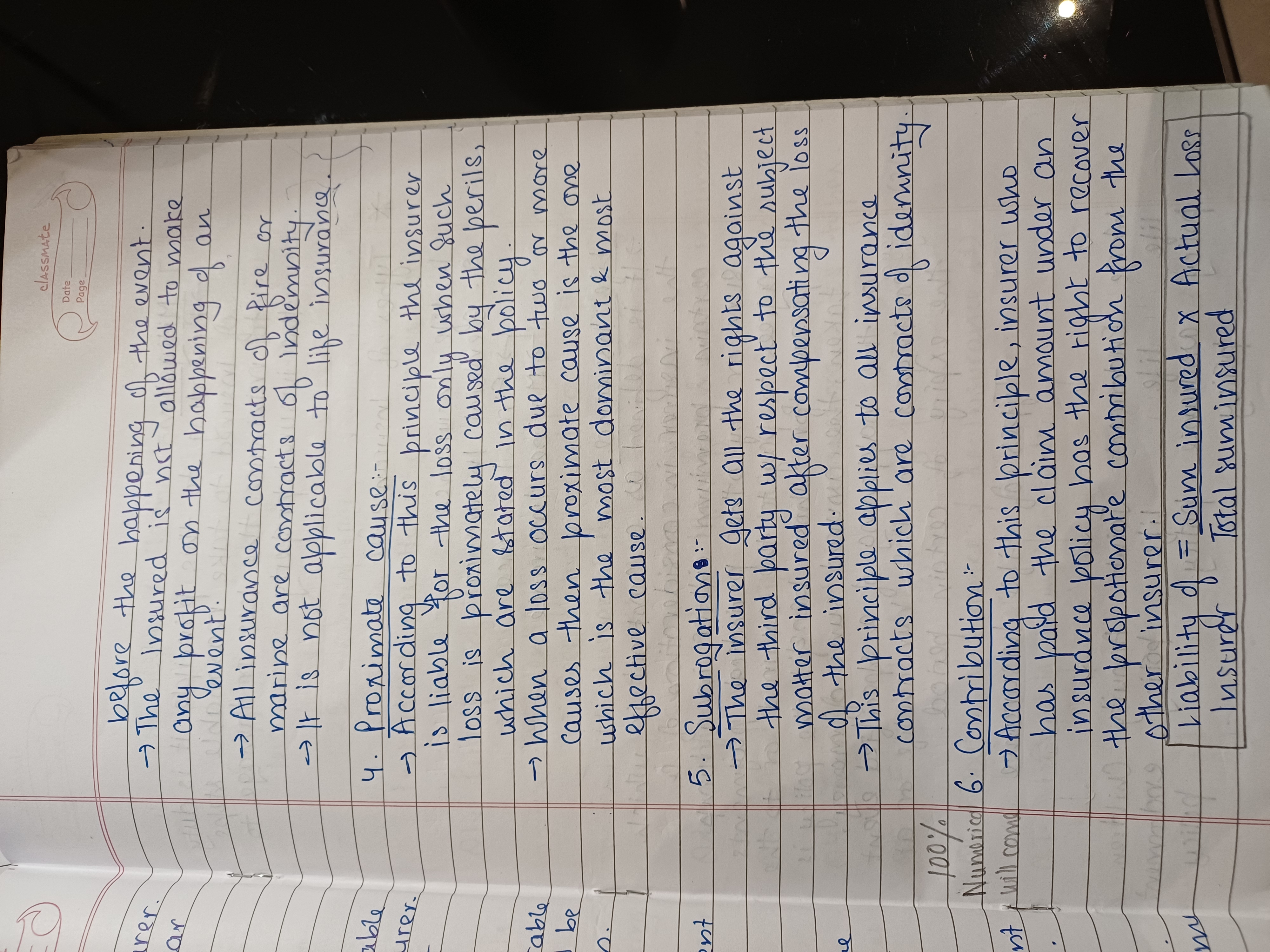 The handwriting is neat and largely uniform, indicating a structured approach to writing. The letter size is moderate, suggesting a balance between assertiveness and consideration for space. There is a right slant in the handwriting which shows the writer to be responsive and forthcoming. Words such as "Proximate cause" are clearly written and well-spaced, contributing to overall legibility. The baseline of the writing is relatively straight, demonstrating a sense of stability. Some letters, like the 'g' in "Subrogations", have a distinctive loop, hinting at a personal flair within the structured style.