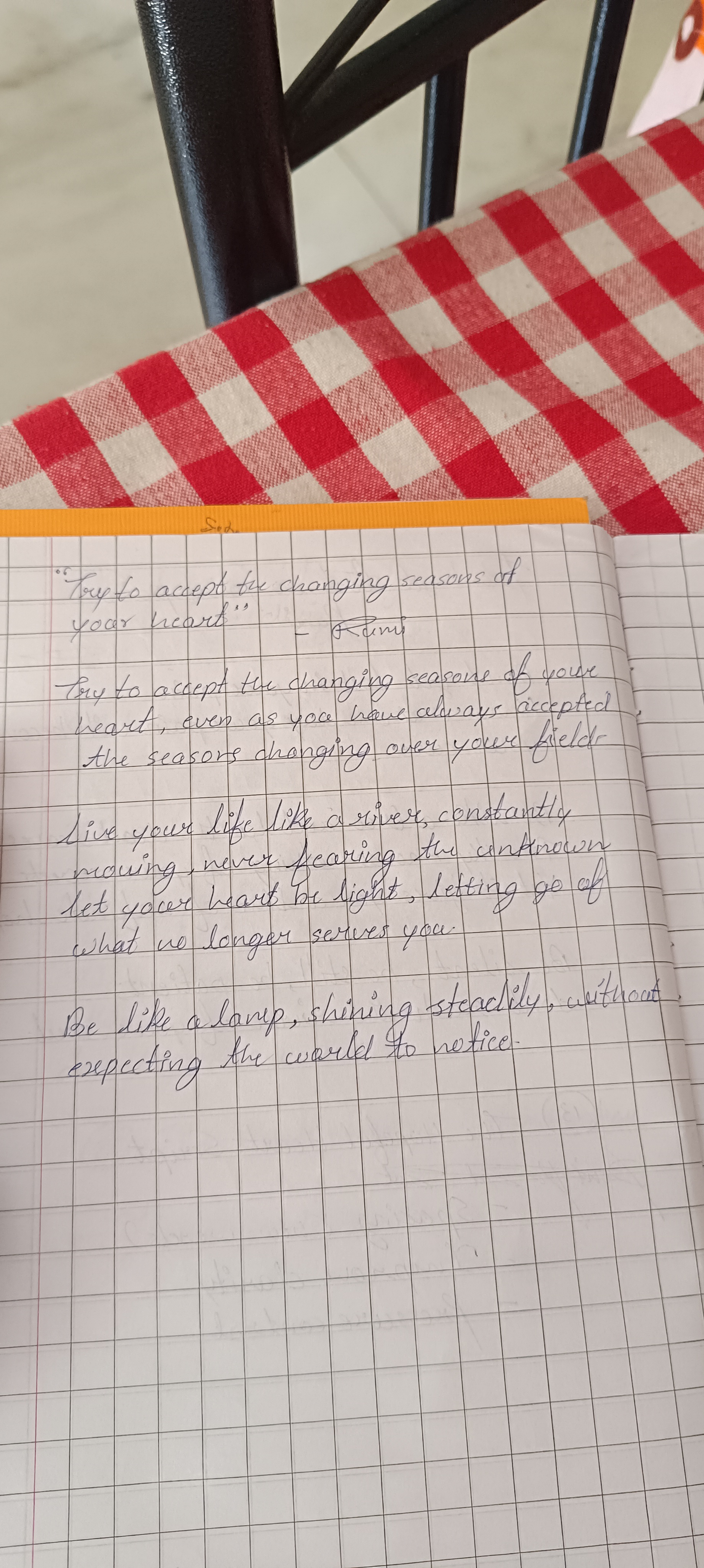The handwriting presents a fluid, almost cursive style, with a gentle slant to the right. The letter formations are rounded, with soft transitions between strokes. There's a sense of openness in the way the letters are formed, particularly in letters like 'o' and 'a'. Words like 'river' and 'seasons' showcase a looping quality, suggesting a rhythmic flow in the writing process. The overall impression is one of measured grace, even if there are minor inconsistencies in letter height and spacing. The handwriting isn't perfectly neat, but it has a unique character.
