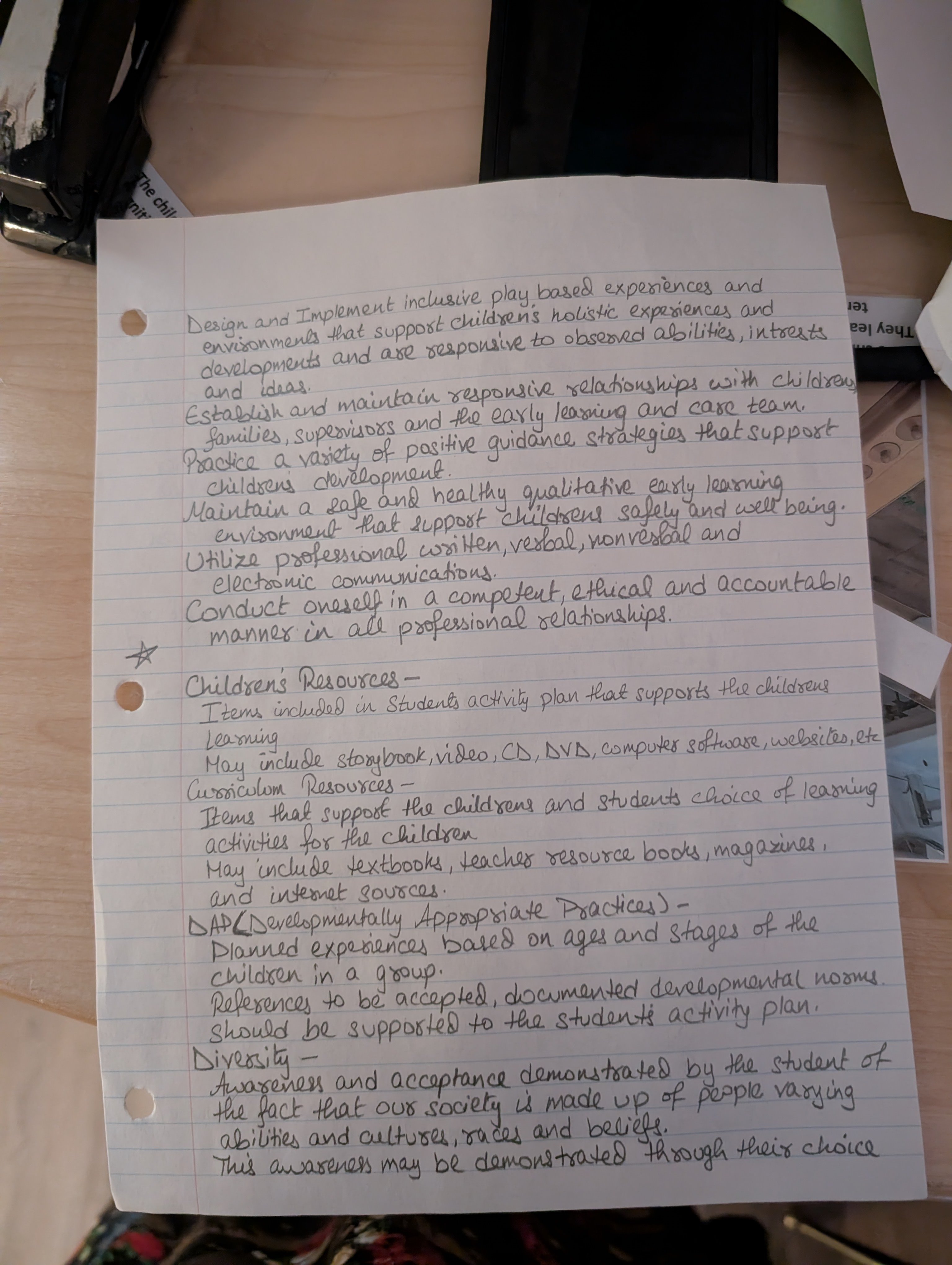 The handwriting is neat and well-formed, demonstrating a clear, rounded style. The script exhibits a consistent slant and size, which indicates a structured approach. The pressure appears to be even, contributing to the overall legibility. The loops in letters like 'l' and 'b' are full and rounded, and the connections between letters are generally smooth. Words are well-spaced, avoiding crowding and enhancing readability, such as "Design and Implement" and "positive guidance strategies".