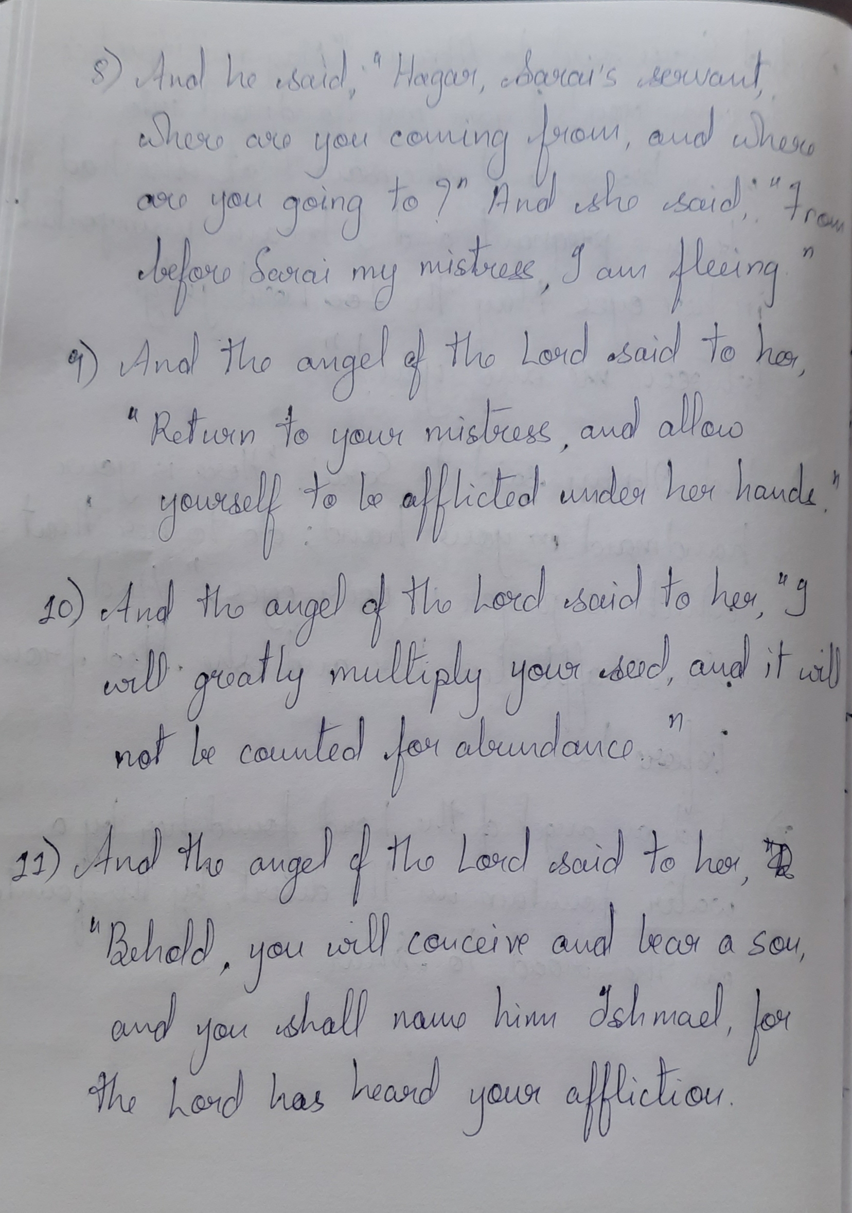 The handwriting sample exhibits a flowing, connected style, as seen in phrases like "Hagar, Sarai's servant" and "the angel of the Lord". The letters are generally well-formed, with a slight slant. There's a good sense of rhythm in the writing, suggesting a natural and unhurried pace. The size is moderate, and the spacing between words is generally consistent. However, the consistency is somewhat affected by occasional variations in letter size and slant. The overall impression is of a neat and legible hand, with a touch of elegance.