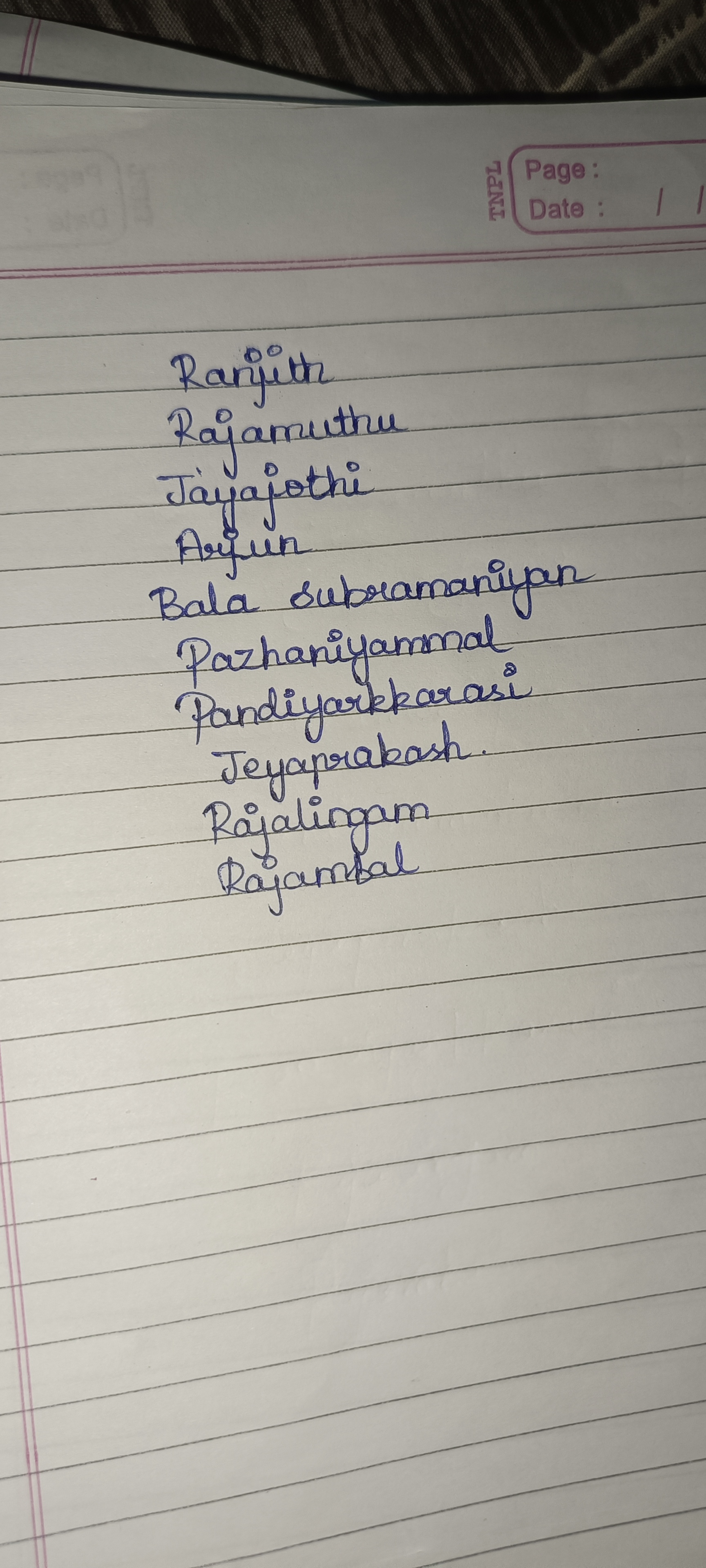 This handwriting sample showcases a neat and organized style. The letters are generally well-formed and upright, exhibiting a consistent slant throughout the text. The rounded shapes, especially in letters like 'a' and 'o', contribute to a soft and approachable appearance. The pressure applied seems moderate, resulting in even strokes that suggest a controlled hand. Overall, the handwriting is legible, with clear distinctions between letters, as seen in words like "Rajamuthu" and "Jeyaprakash".