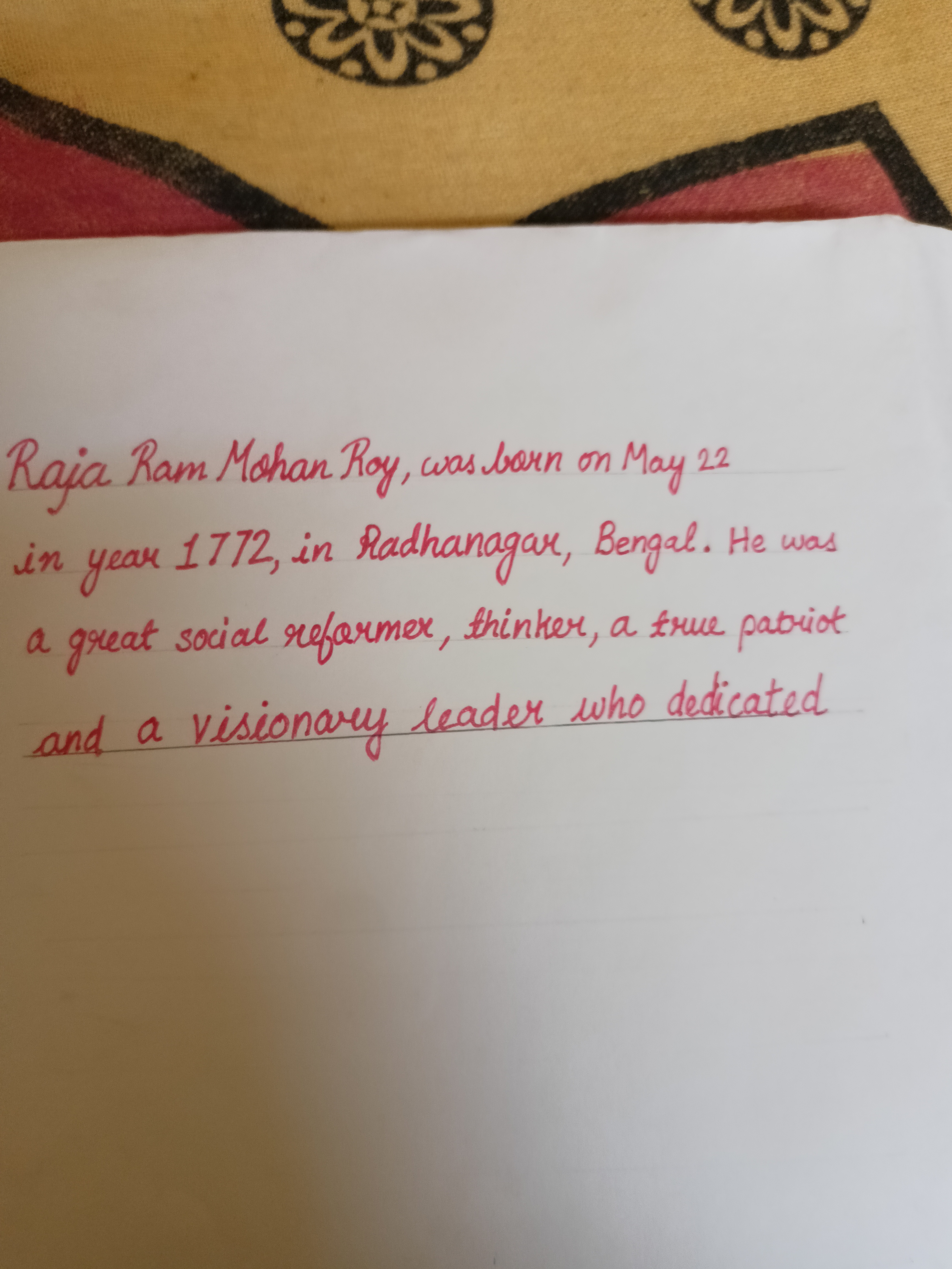 The handwriting in this sample exhibits a neat and rounded style, with consistently formed letters. The gentle curves and the even spacing between words, such as in "Raja Ram Mohan Roy" and "true patriot", suggest a deliberate and controlled hand movement. There's a noticeable lack of extreme slants or flourishes, contributing to an overall impression of restraint and clarity. The handwriting is fairly legible and appears to be well-practiced, demonstrating a commitment to clear communication.