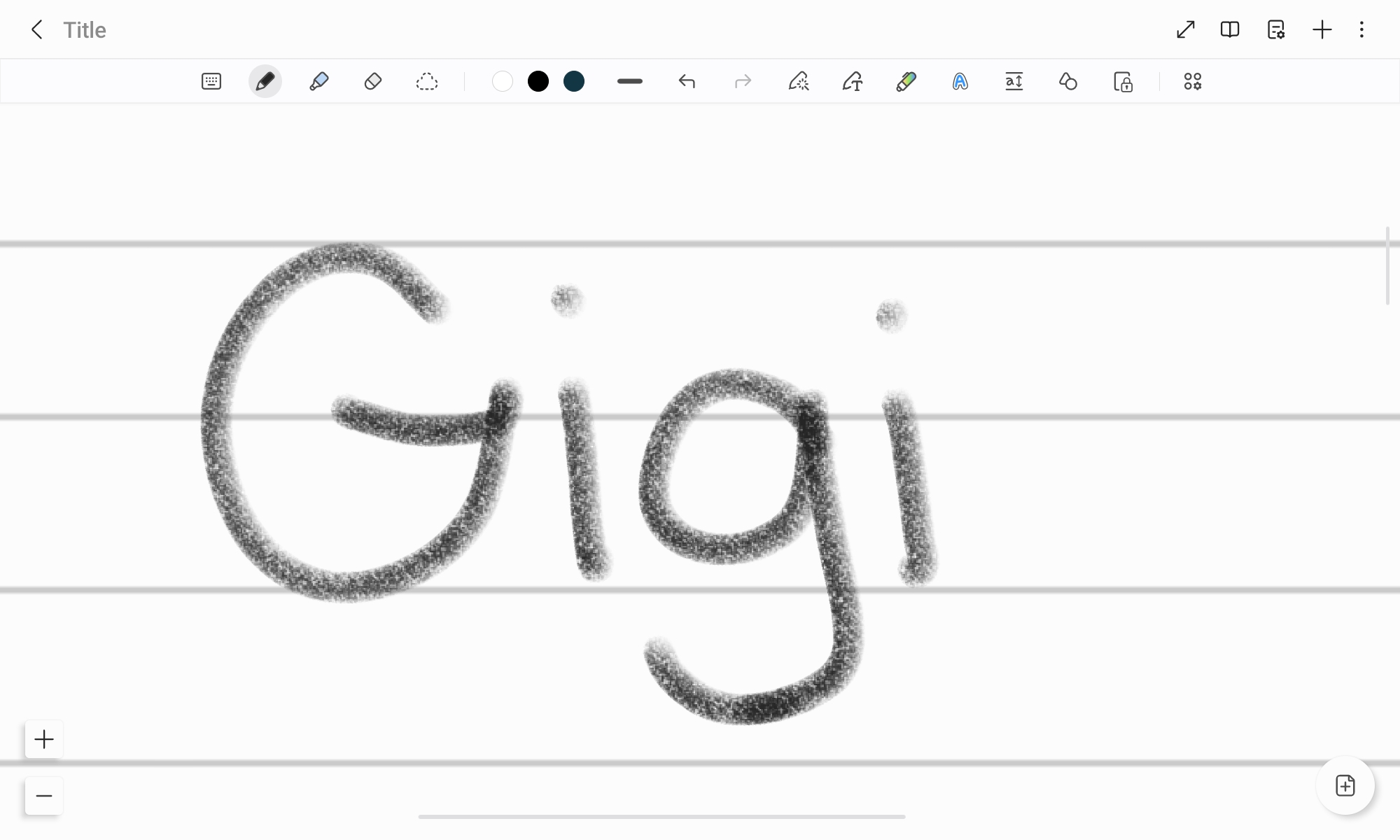 The handwriting presents a rather playful and oversized style, as demonstrated by the large, rounded "G" and the tall, somewhat childlike "i"s. The letters appear to be drawn rather than written with speed, suggesting a deliberate and careful approach. There's a certain whimsical quality to the strokes, almost as if each letter is a character in a story. The handwriting fills up a large amount of space on the page, suggesting boldness.