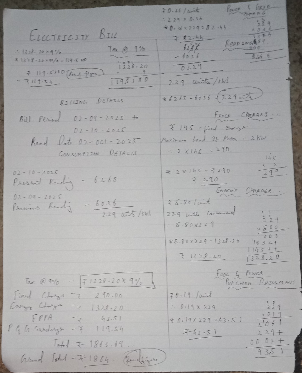 The handwriting exhibits a utilitarian style, prioritizing function over form. Letterforms are generally simple and angular, seen in the numerals and abbreviations like 'kWh'. The slant is minimal and upright, suggesting a controlled demeanor. There's an effort toward neatness, with figures and text aligned, particularly in the calculations, but consistency varies; for example, the size of the '₹' symbol fluctuates. The handwriting's legibility is decent, yet somewhat dense, and shows the influence of printing more than cursive writing.