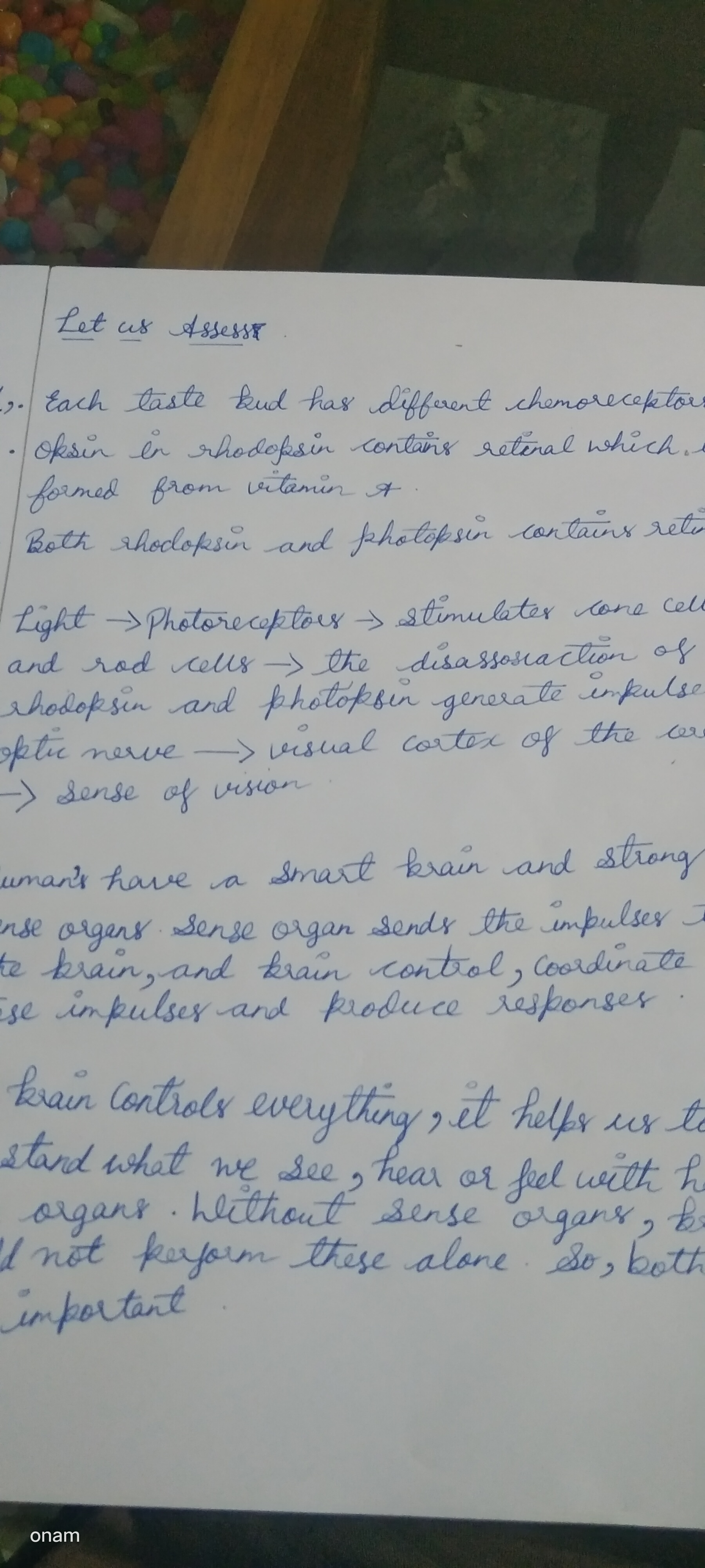 The handwriting is neat and organized, demonstrating a clear, flowing script with a slightly rounded letter formation. The consistent slant and uniform letter size contribute to an overall impression of carefulness and precision. There's a noticeable effort to maintain legibility, evident in the well-formed letters and consistent spacing, such as between 'taste bud' and 'chemoreceptors'. The connections between letters are smooth, suggesting a degree of fluency, though there are some breaks that indicate a thoughtful, deliberate approach to writing.