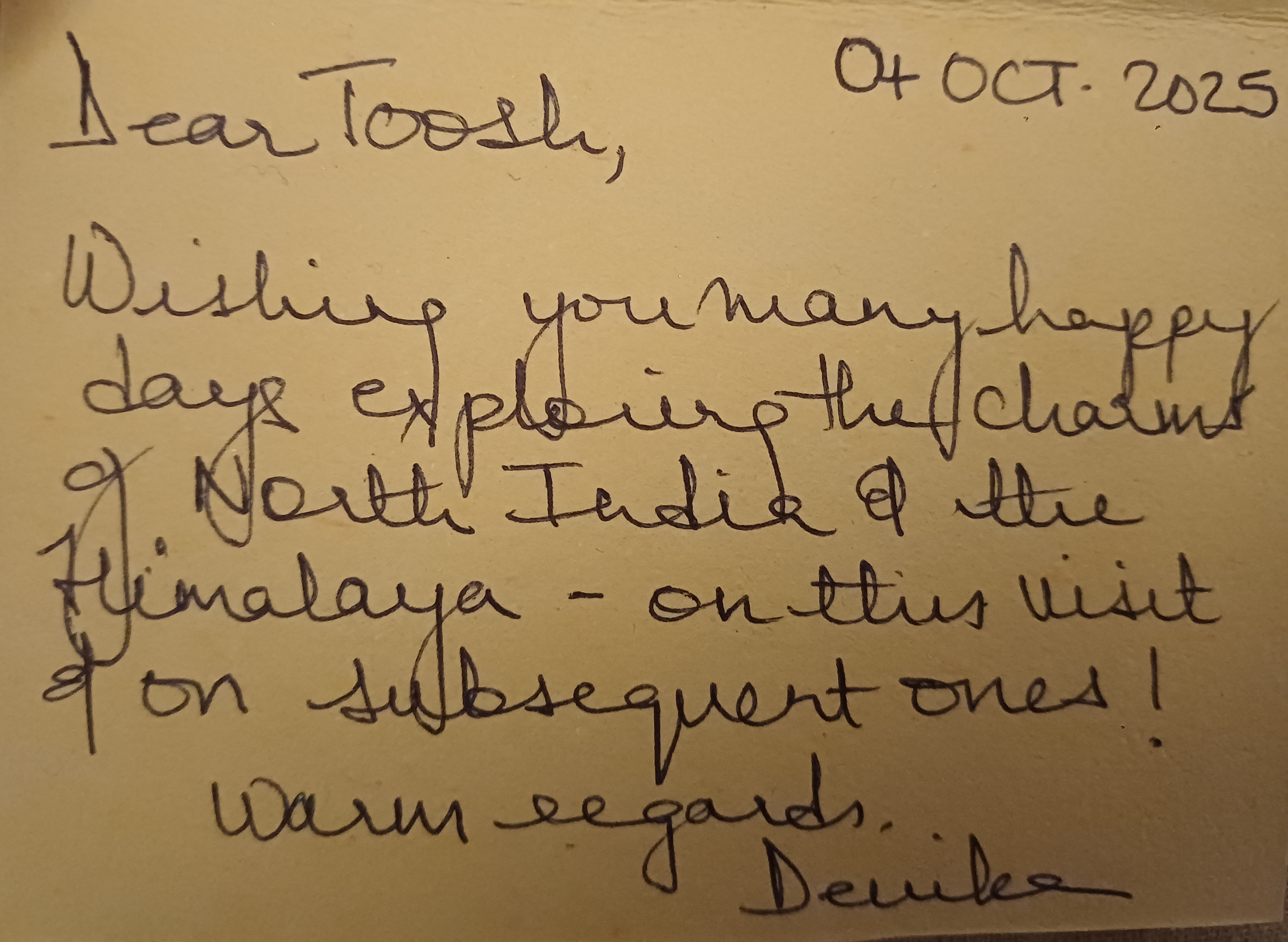 The handwriting style is characterized by a flowing, cursive script, with some letters distinctly rounded, like the 'o' in 'Toosh' and 'exploring'. There is a noticeable slant to the right, and the letter size is generally uniform, though there's some variation, for example, in the relative sizes of 'North India' and 'Warm regards'. The writing is mostly connected, showcasing fluency, but there are breaks between some words. The pressure appears consistent, and the baseline is relatively stable. The overall impression is neat but with a personal touch, avoiding rigid formality.