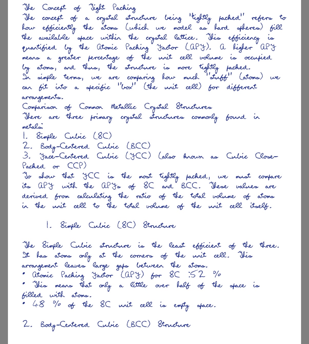 The handwriting presents a blend of neatness and technical precision, evident in the consistently formed letters and relatively uniform spacing. The sample, focused on crystal structures, exhibits a deliberate and controlled hand, with distinct letter formations and minimal flourishes. The use of terms like "tightly packed" and "Atomic Packing Factor (APy)" is indicative of someone familiar with scientific notation and detail.