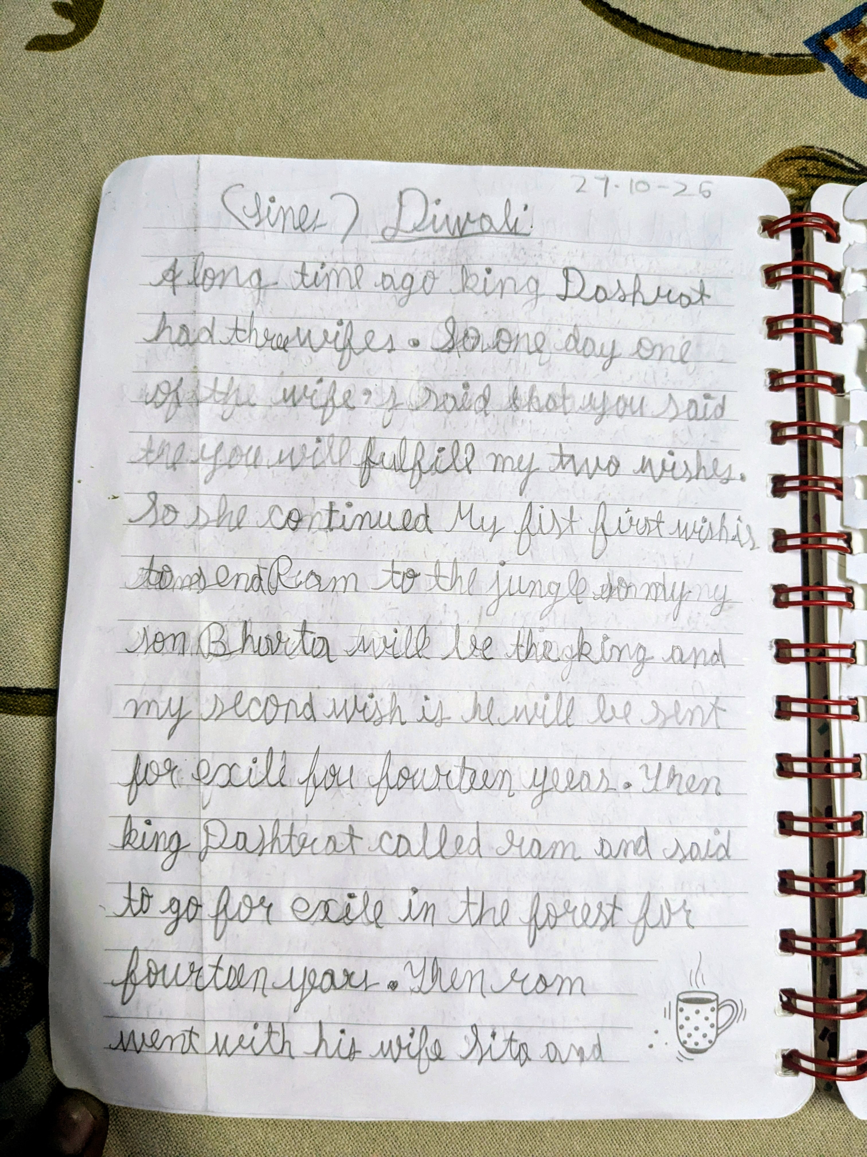 The handwriting is characterized by a gentle, flowing script with rounded letterforms, as seen in words like "Diwali" and "ago". There's a notable forward slant, suggesting enthusiasm. The writing exhibits a degree of inconsistency in letter size and spacing, for example, in the phrase "my second wish", indicating a somewhat relaxed approach. The baseline wavers slightly, lending a touch of whimsy to the overall appearance. While mostly legible, some letter formations, such as the 'r' and 't', could be clearer.