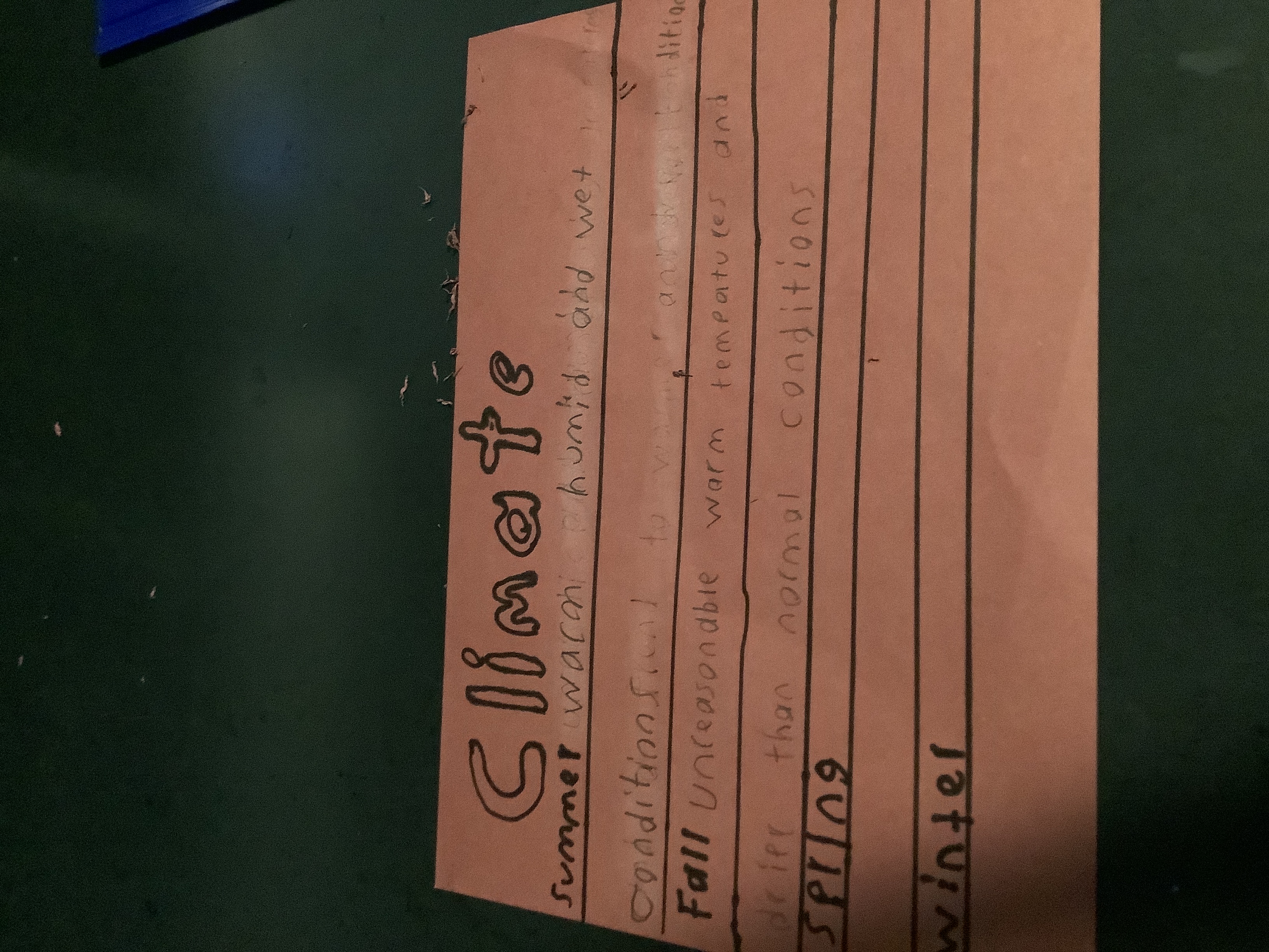 The handwriting style is characterized by its large, rounded letter forms, most notably in the word "Climate". The letters are generally upright, showing little slant. There's a mixture of printing and cursive elements, especially evident in the connecting strokes between some letters. The pressure applied is fairly consistent, resulting in a uniform stroke thickness throughout the writing sample. Overall, the handwriting appears somewhat childish and lacking in sophistication, but is reasonably legible.