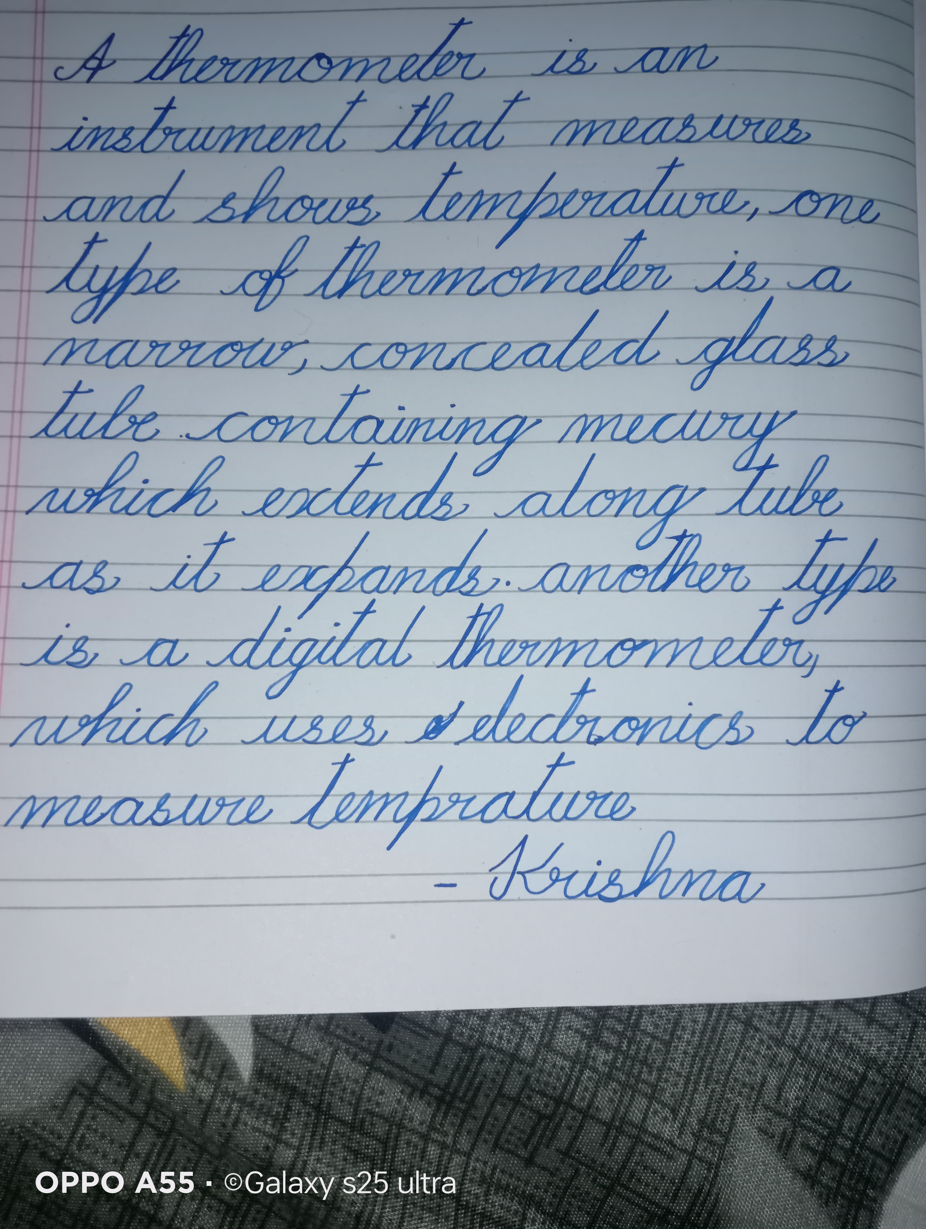 This handwriting exudes a certain elegance and poise. The rounded forms of the letters, as seen in words like "thermometer" and "temperature," suggest a gentle, flowing hand. The consistency is quite notable, with a uniform slant and spacing throughout the sample. There's a sense of carefulness and deliberation, hinting at a writer who values neatness and precision. The cursive is consistent throughout the document, even to the point of ending the name "Krishna" with the same flourish as other letters.
