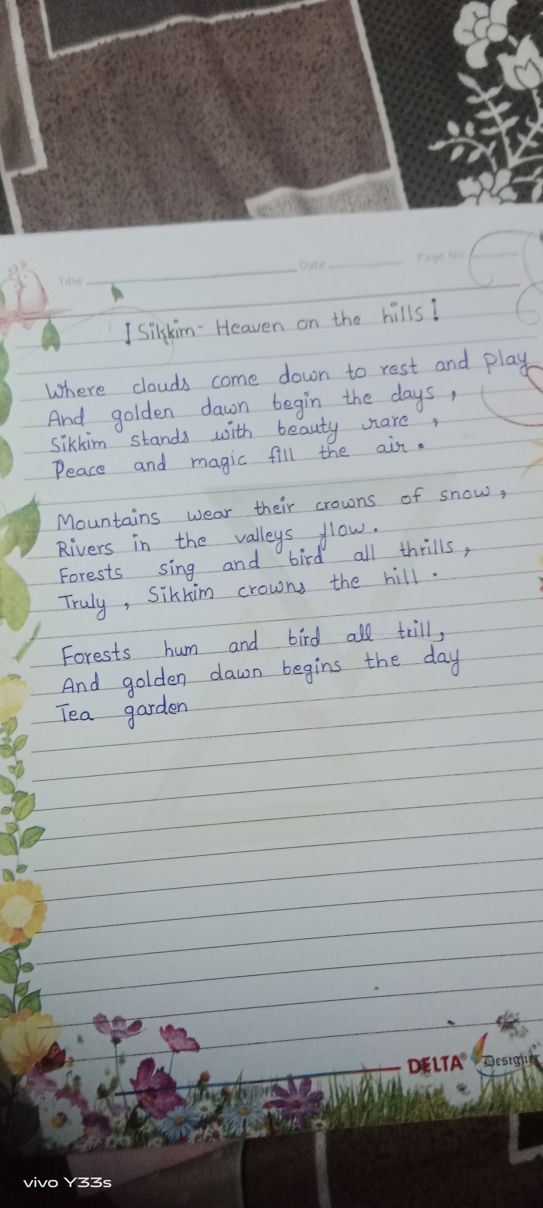 This handwriting style often reflects a personality that is empathetic, harmonious, and artistic. The rounded forms and even pressure indicate a considerate and cooperative nature, while the rightward slant suggests someone who enjoys connecting with others and expressing their feelings. The overall neatness points to an organized mind and a desire for clarity. The choice of words and poetic expression suggest a creative and imaginative individual with a love for beauty and tranquility.