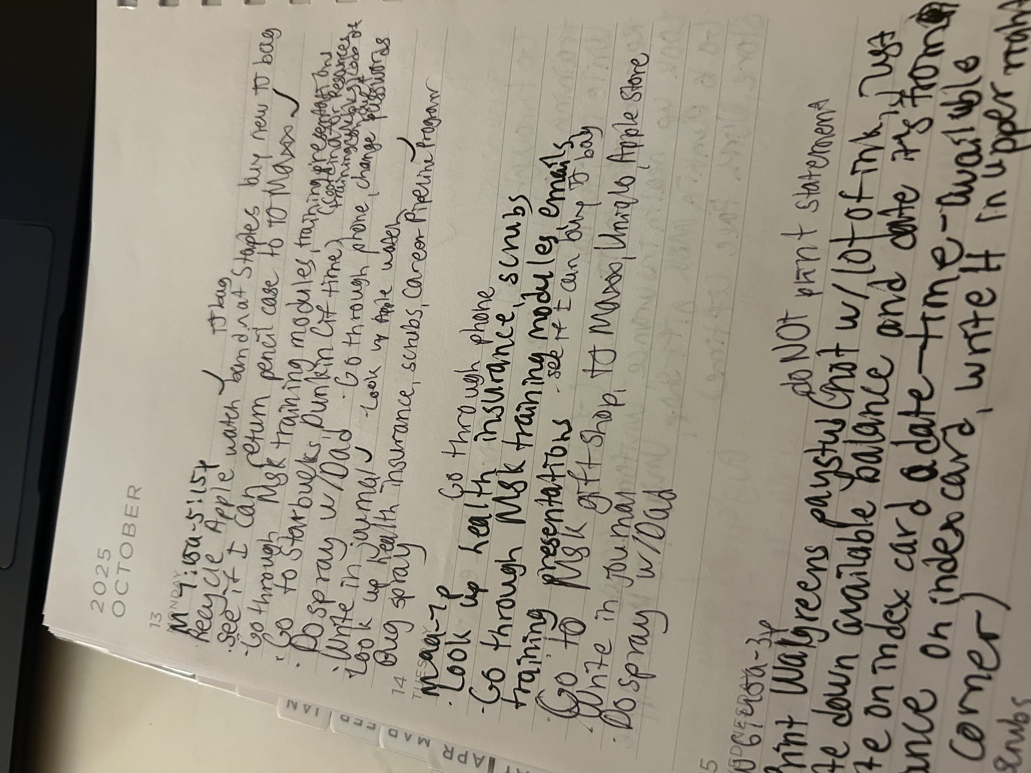 This handwriting exhibits a blend of practicality and hurried efficiency. The individual letters lean slightly to the right, suggesting a forward-thinking nature, while the compressed spacing indicates a desire to pack as much as possible into each moment. Phrases like "Recycle Apple watch band nat Staples" and "Go through Msk training modules" are written with an economy of strokes, prioritizing speed and function over artistic flourish. There's a sense of urgency conveyed in the script, almost as if the writer is racing against time to capture every fleeting thought and task.