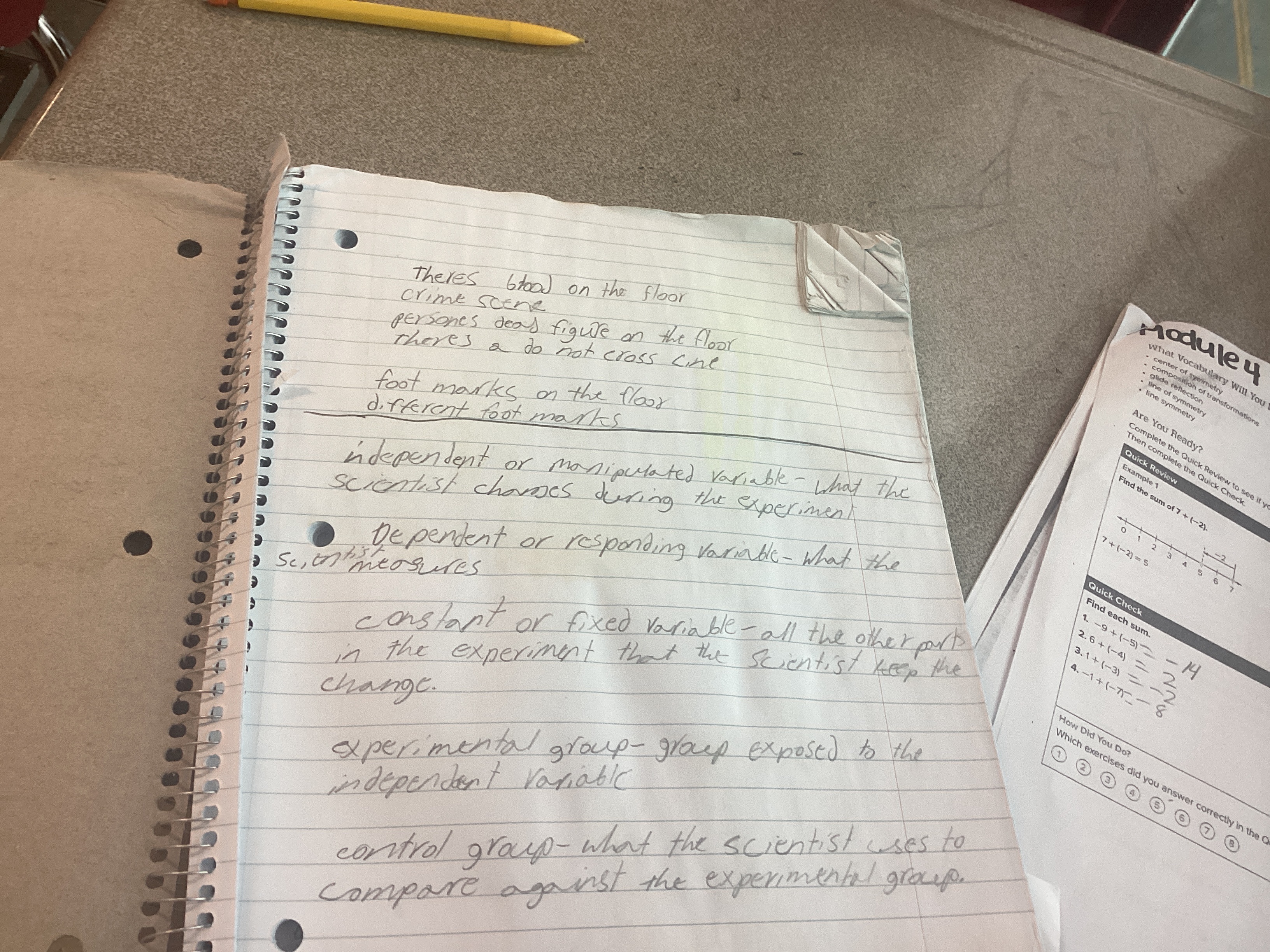 The handwriting sample displays a style that's practical and direct. The writing is somewhat slanted, suggesting a blend of emotional expression and a grounded approach. The letters are generally well-formed, though there are inconsistencies in size and spacing. Some words like "Theres blood on the floor" appear rushed, while phrases like "independent variable" are more carefully written. There's a functional, rather than artistic, quality to the script, focused on conveying information efficiently.