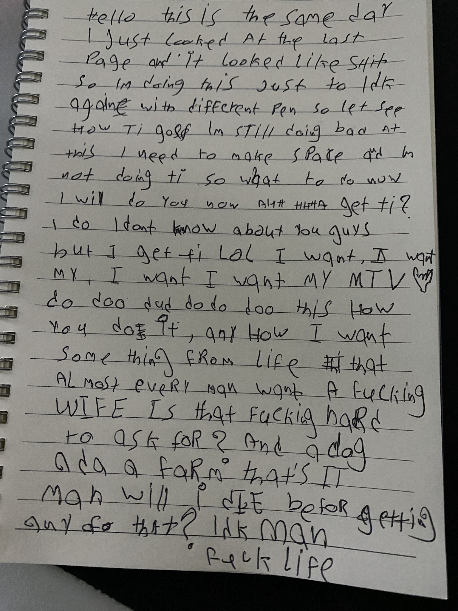 Based on the sample, the writer appears to be expressive and possibly prone to impulsivity. The content is unfiltered, raw, and emotional, reflecting a candid and somewhat rebellious nature. There's a hint of humor mixed with frustration, evident in phrases like "AHH HHHA get ti?" and the self-deprecating remark about "still doing bad." This suggests a personality that's both playful and easily exasperated. The writer is opinionated and not afraid to express dissatisfaction.