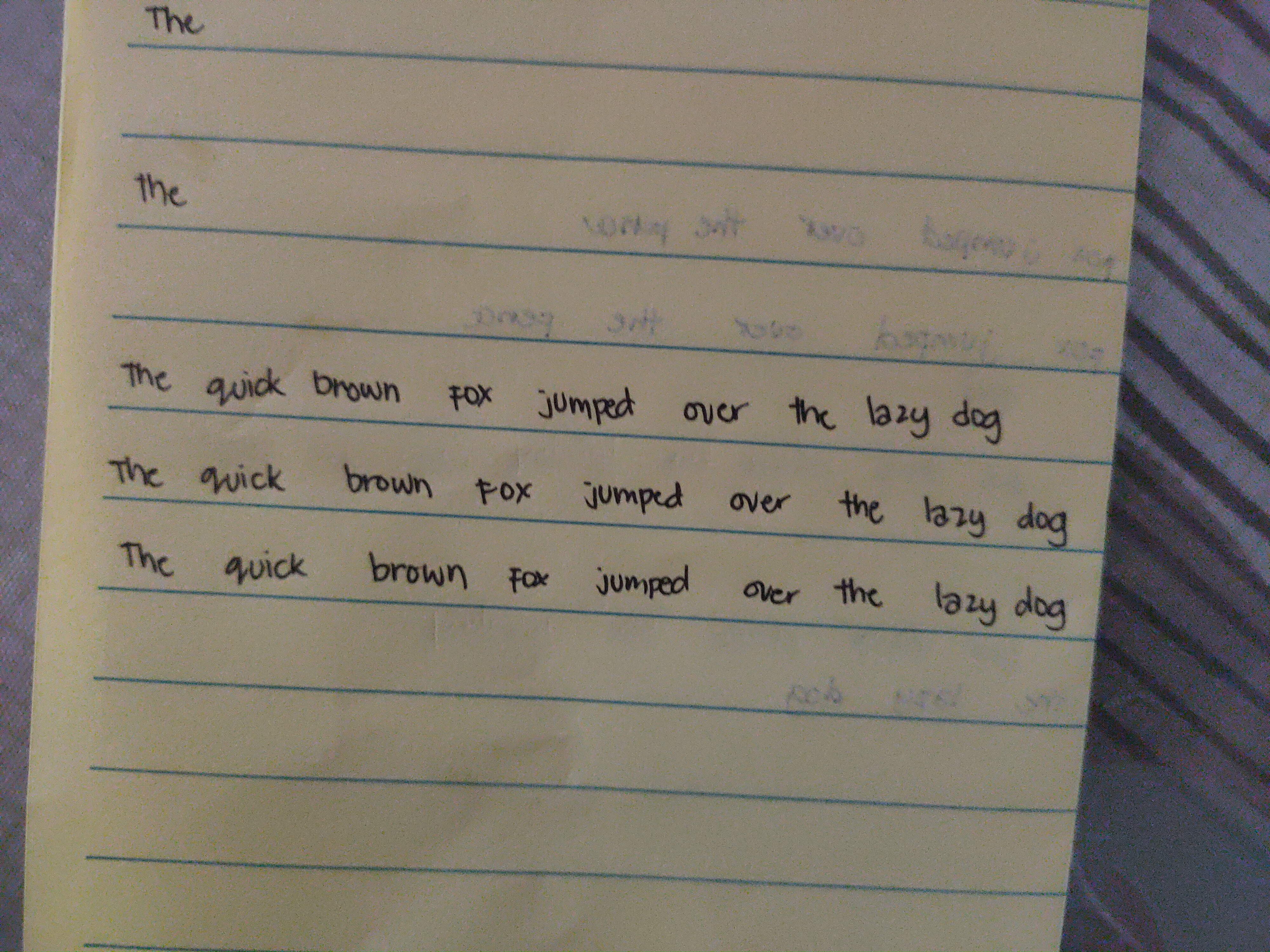 The handwriting style is generally neat and legible, with consistent letter sizing and spacing. The letters are formed clearly, and the lines of text are relatively straight, following the lines of the paper. There's a slight forward slant, and the pressure appears even throughout the writing. Some of the letters, like the 'y' in "lazy", have loops that extend below the line, adding a touch of flair.