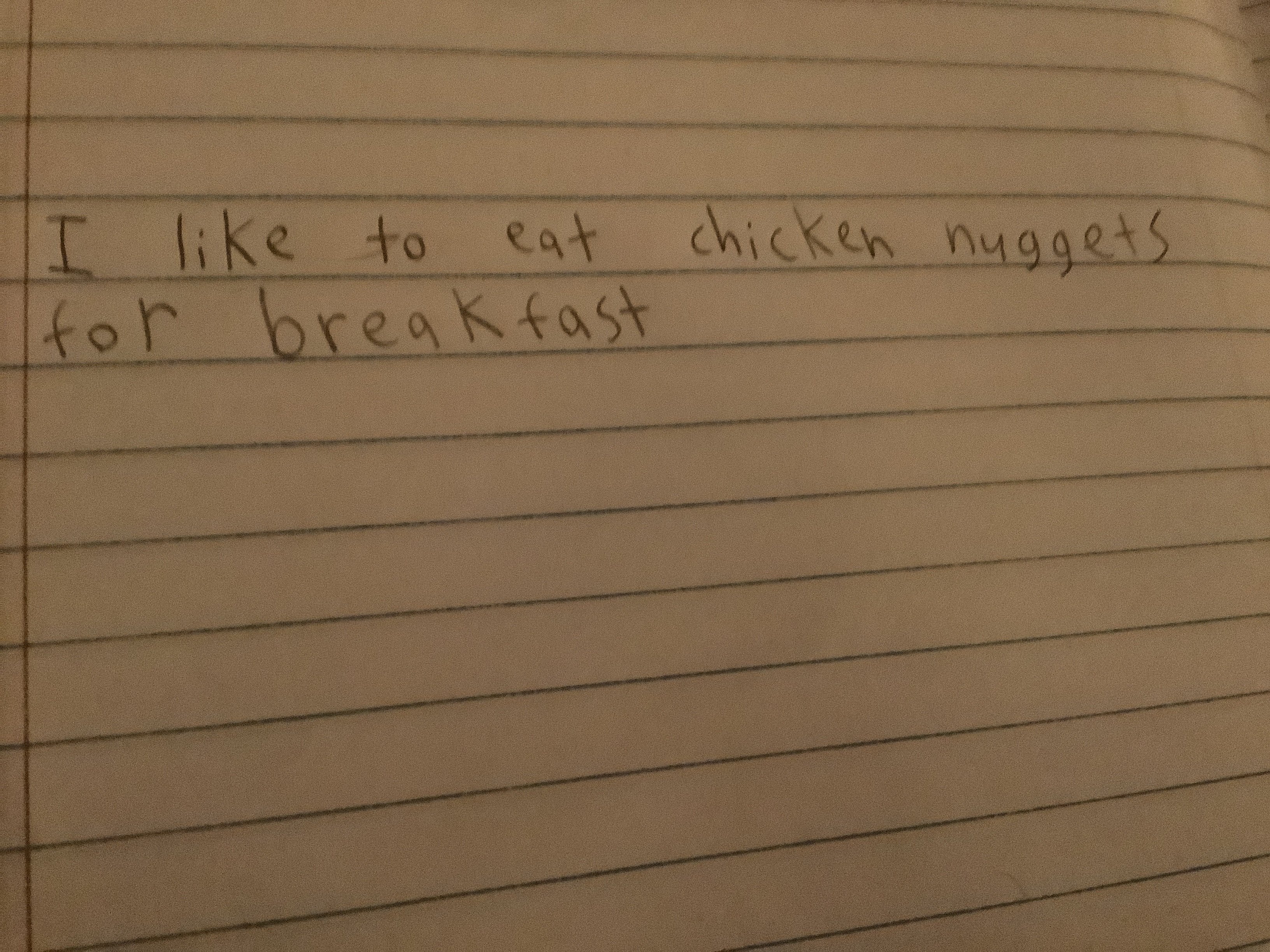 The handwriting presents as simple and straightforward. The letters are mostly upright, with a slight slant. There's a general neatness to the writing, with the letters being clearly formed and evenly spaced. The size is moderate, filling the lines adequately without being overly large or small. There's a noticeable effort to stay within the lines, indicating a level of control and awareness of boundaries. The phrase "chicken nuggets for breakfast" stands out due to its whimsical nature and slight variation in letter formation compared to the rest of the text.