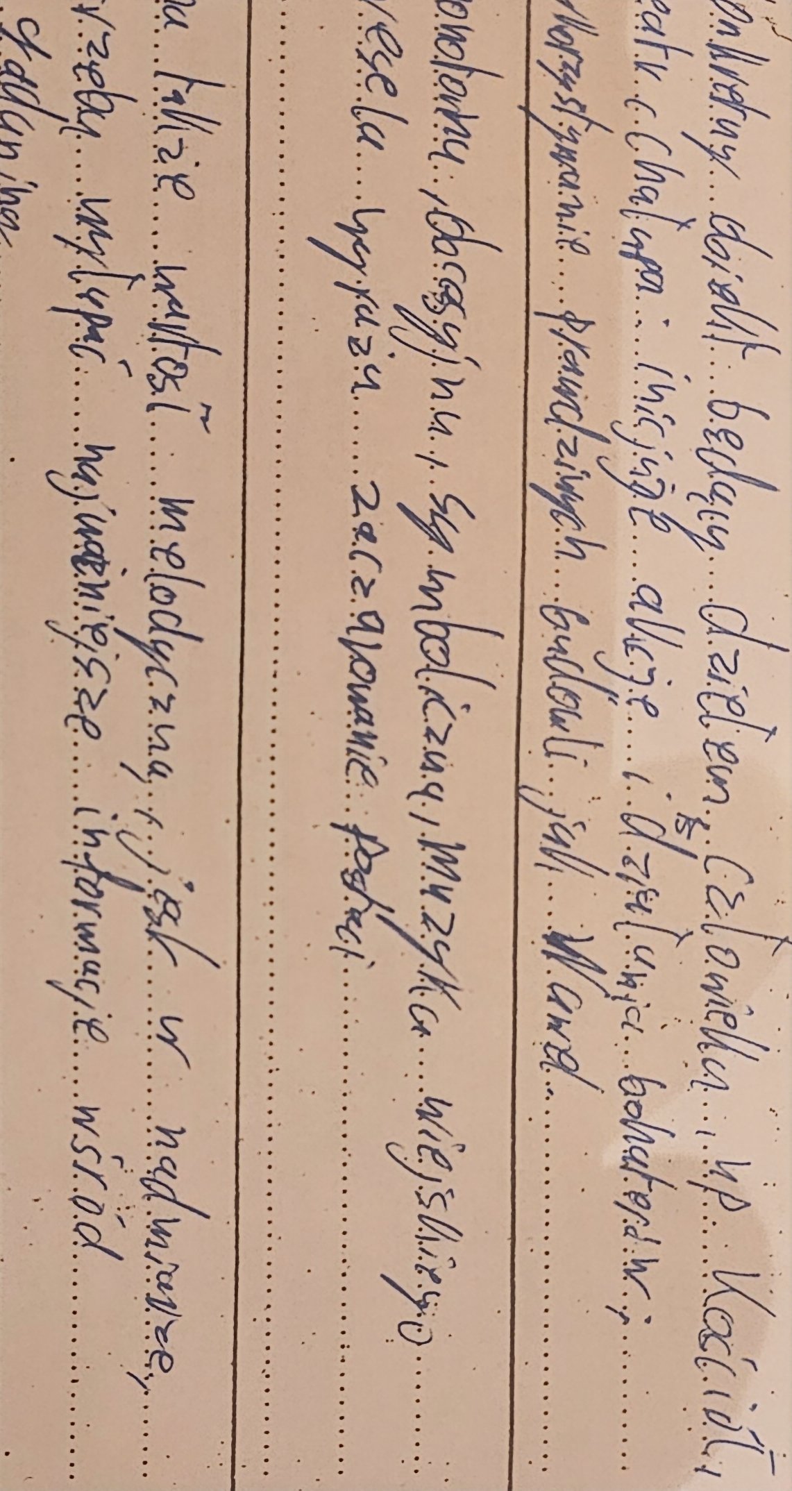 This handwriting leans towards a flowing, connected style, indicative of someone who likes to keep their thoughts moving. The script is relatively neat, though the baseline wavers slightly, giving it a playful, almost whimsical character. There's a distinctive loopiness to some of the letters, like the 'l' and 'y' in words such as "calamiellen" and "muzyka", which adds to its unique charm. The overall impression is of someone who enjoys writing and doesn't take themselves too seriously.