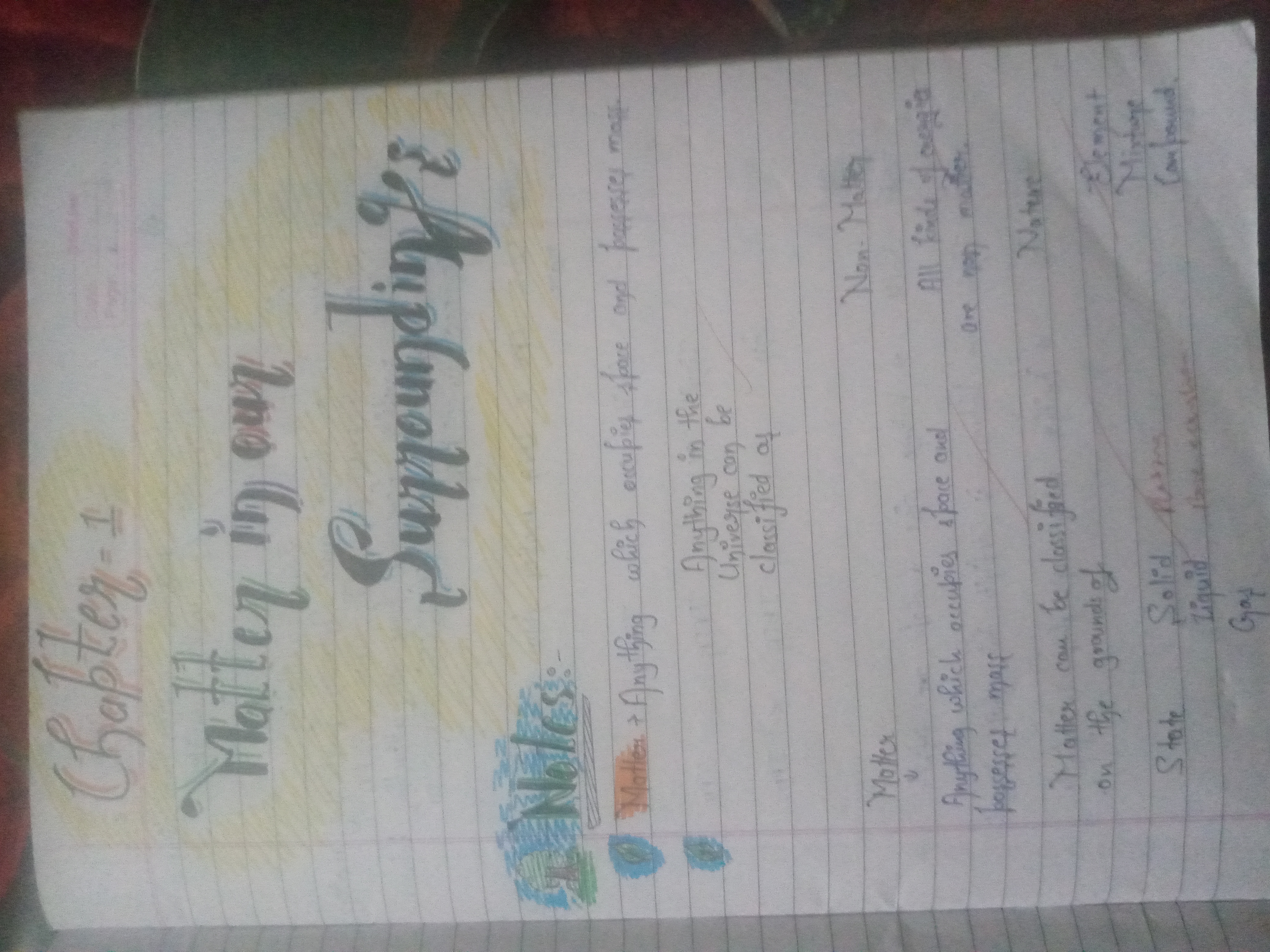 The handwriting sample displays a mix of neatness and slight inconsistency. The initial impression is that of someone who values presentation, as seen in the stylized title "Matter in our Surroundings". However, the lowercase script, particularly in the notes, exhibits a more casual, almost hurried style. Letter formations are generally clear, but there's some variability in letter size and spacing, for example the words 'occupies space'. Overall, the handwriting is legible, though a closer look reveals areas where attention to detail could be improved.