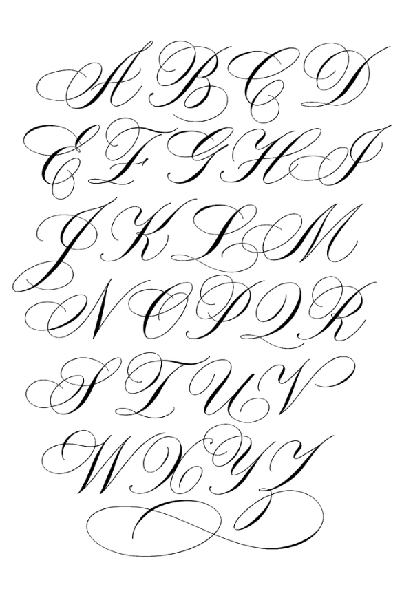 This handwriting style is characterized by its elaborate flourishes and elegant curves. The letterforms exhibit a high degree of consistency, with each letter meticulously crafted to maintain a uniform appearance. The overall impression is one of refined artistry, where the strokes flow seamlessly from one character to the next. Note the 'A', 'C' and 'Y' in particular.