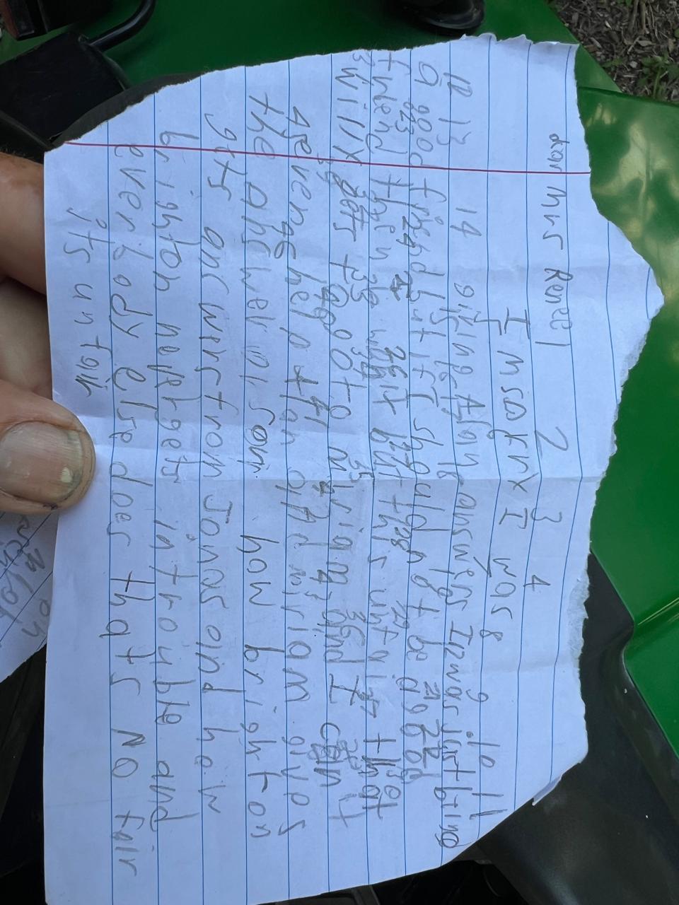 Based on the handwriting, one might infer a straightforward and perhaps somewhat emotionally reactive personality. The rightward slant suggests a desire for connection and expression, while the variable letter size could indicate fluctuating moods or energy levels. The simplicity of the letter forms might suggest a practical and direct approach to life. The content of the text also indicates a strong sense of fairness.