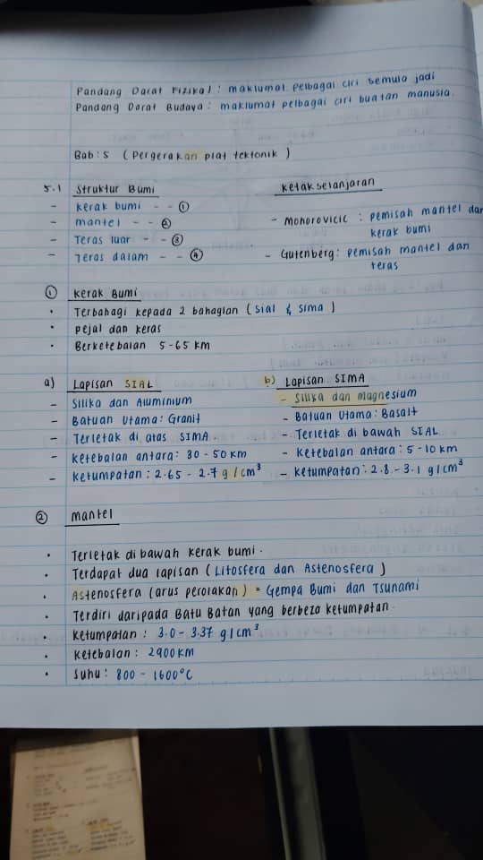 The handwriting is neat and quite uniform, suggesting a methodical approach to note-taking. The consistent slant and letter formation, seen in words like "Pandang" and "maklumat", indicates a disciplined hand. There's a clear effort to differentiate between headings and body text, with headings often underlined or written slightly larger. The use of bullet points and numbering further organizes the information, as shown in "5.1 Struktur Bumi". Overall, the writing is functional and clear, prioritizing legibility for future reference.