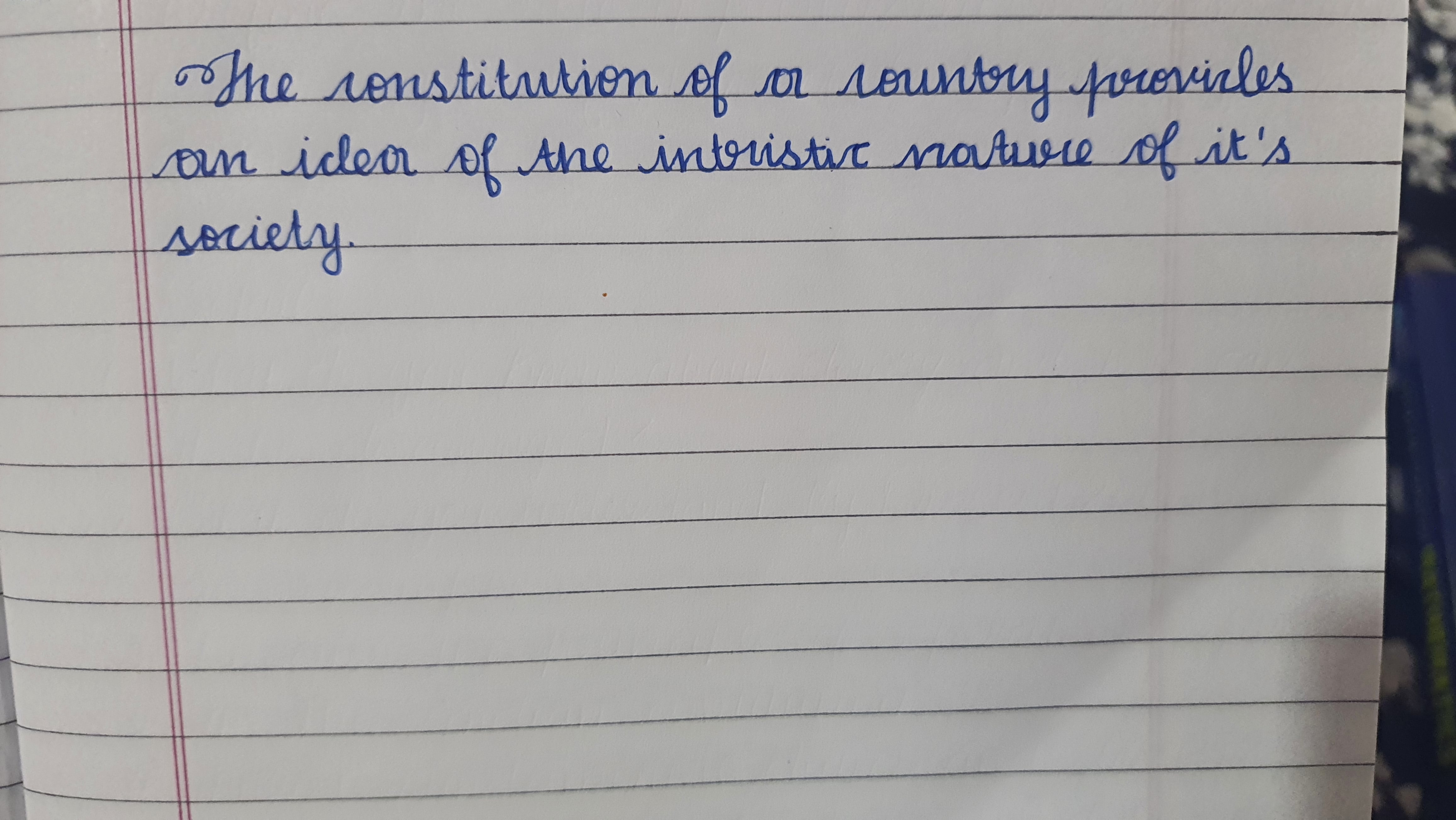 The handwriting sample showcases a flowing, connected script with rounded letter formations, as seen in words like "constitution", "nature", and "society". The slant is generally upright, indicating a balanced approach. There is a sense of rhythm and grace, suggesting a natural and fluid writing style. The letter size is consistent, indicating a steady personality. The pressure appears even, showing control and focus.