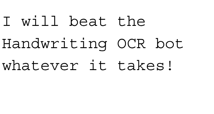 This handwriting style suggests a personality that values clarity and directness. The uniformity indicates a controlled and disciplined nature, someone who appreciates order and structure. The determination to "beat the Handwriting OCR bot whatever it takes!" reflects a competitive spirit and a willingness to persevere to achieve goals. The person may also possess a practical and methodical approach to tasks, preferring precision over spontaneity.