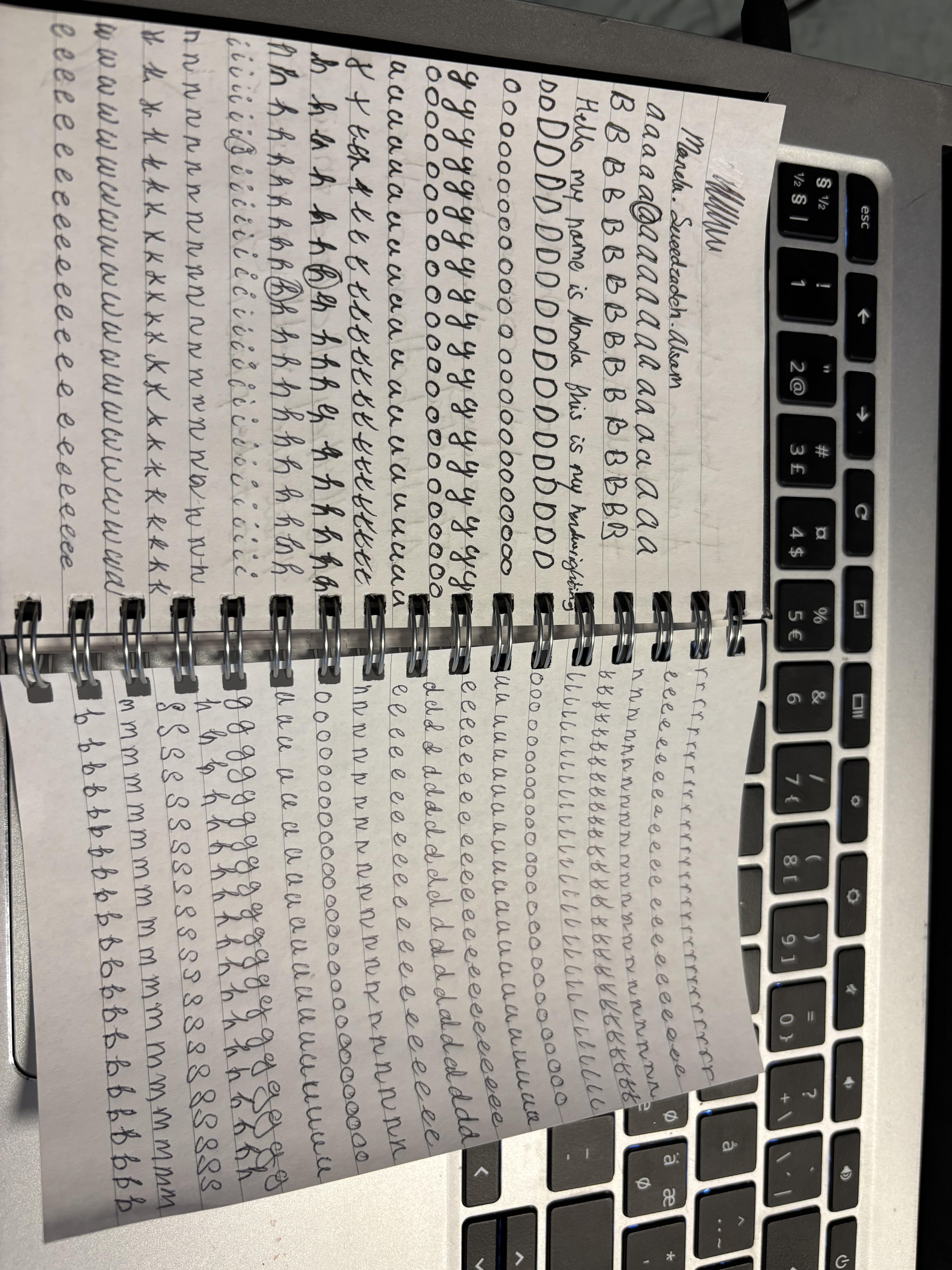 This handwriting showcases a clear focus on mastering letterforms. The repeated rows of 'a', 'B', 'D', 'o', 'g', 'u', 't', 'h', 'i', 'n', 'k', 'w', 'e', 'r', 'l', 'd', 's', and 'b' reveal a deliberate practice. The writing appears neat, although perhaps a little forced, and the individual letter shapes are generally well-formed. There is a noticeable effort to maintain consistency in letter height and spacing, especially in the repeated characters. The sample phrase "Hello my name is Morda this is my handwriting" is relatively legible, despite the stylized letterforms.