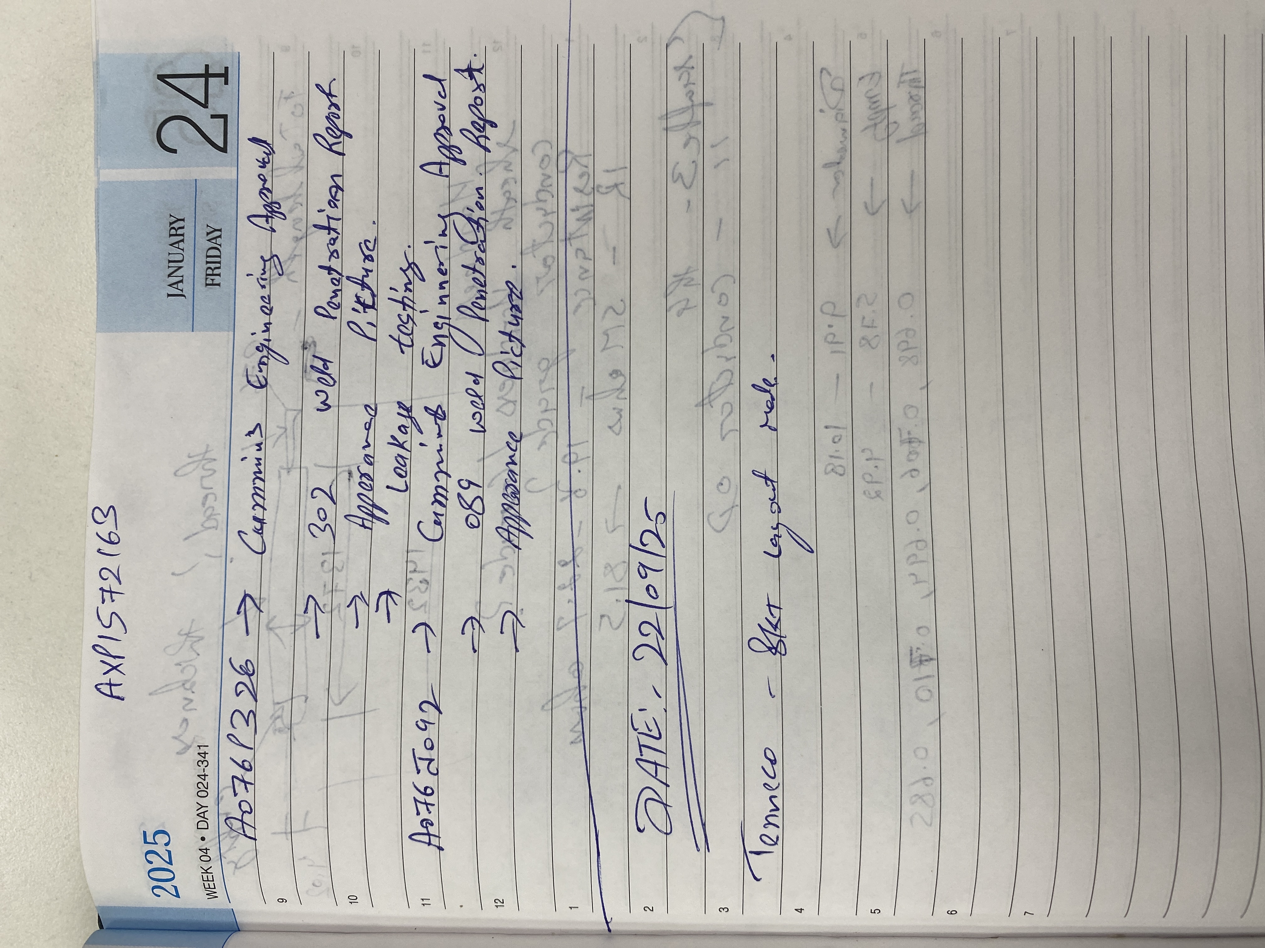 The handwriting presents a blend of practicality and efficiency, evident in the slightly angular letter formations and the consistent slant to the right. Words like "Cummins Engineering Approved" and "Leakage testing" are written with a clear intention to convey information concisely. There's a functional quality to the writing, prioritizing legibility for personal use over aesthetic flourish. The size is relatively uniform, suggesting a steady hand and a methodical approach to note-taking.