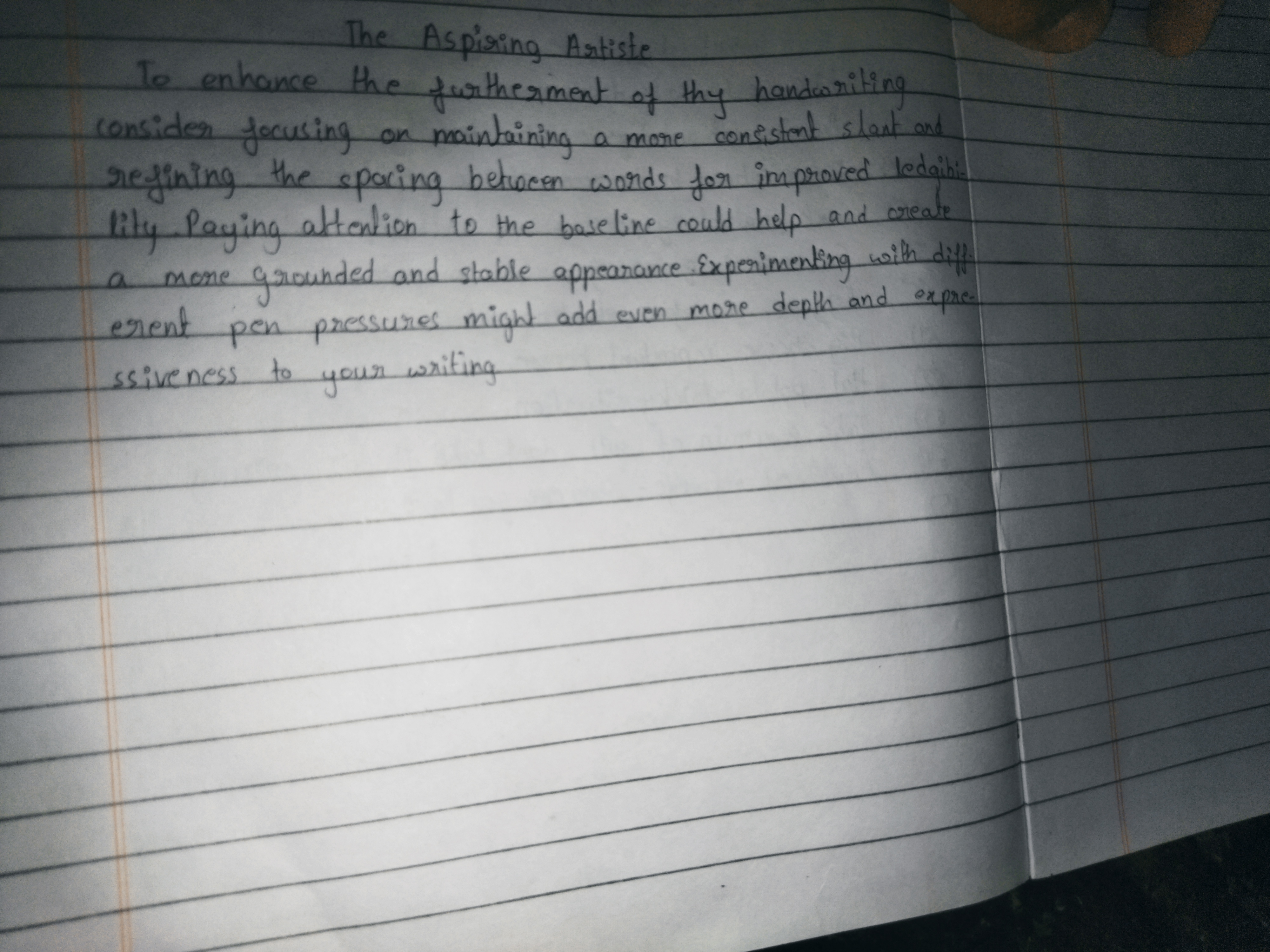 Your handwriting is neat and orderly, reflecting a desire for precision and self-improvement. Further attention to slant, pen pressure, and baseline consistency would improve its expressiveness and aesthetic appeal.