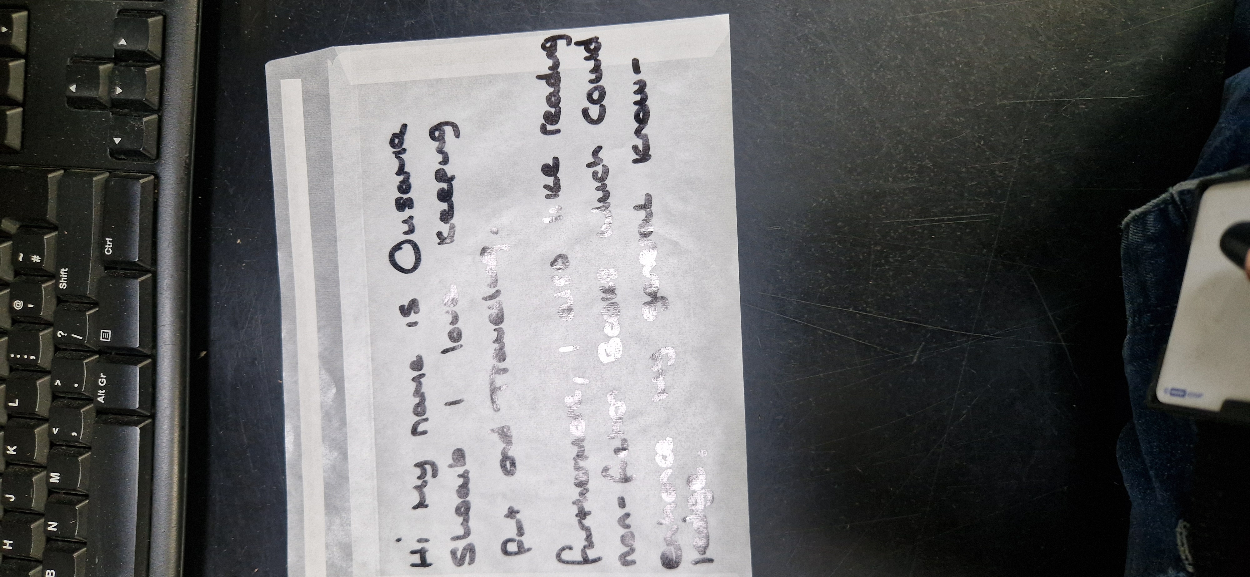 The handwriting presents a somewhat blocky and upright style. There is a mix of rounded and angular letter formations. For example, the 'o' in 'love' is round, while the 'k' in 'keeping' has sharper angles. The size of the letters is fairly consistent, although there's a slight variation between words. The writing is generally neat but could be more legible in certain areas, especially towards the end of the sample.