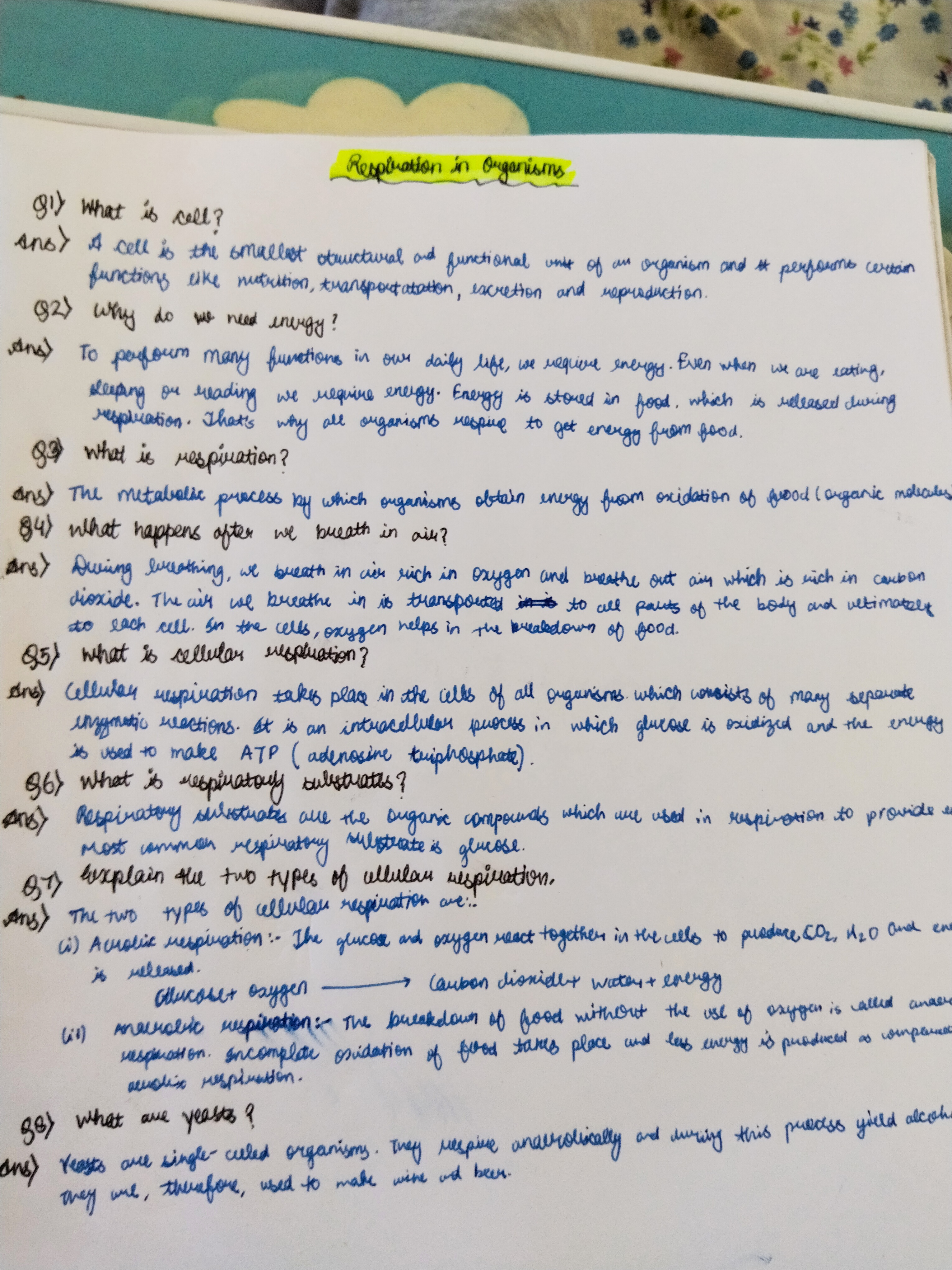 The handwriting presents as neat and well-formed, though with some inconsistencies. Letters are generally upright, showing a lack of slant, but some words are crowded together while others are more spaced out. The writer seems to favor rounded letterforms, as seen in words like "organism" and "respiration". There's an attempt at precision, though the baseline wavers a little, giving it a somewhat informal appearance.