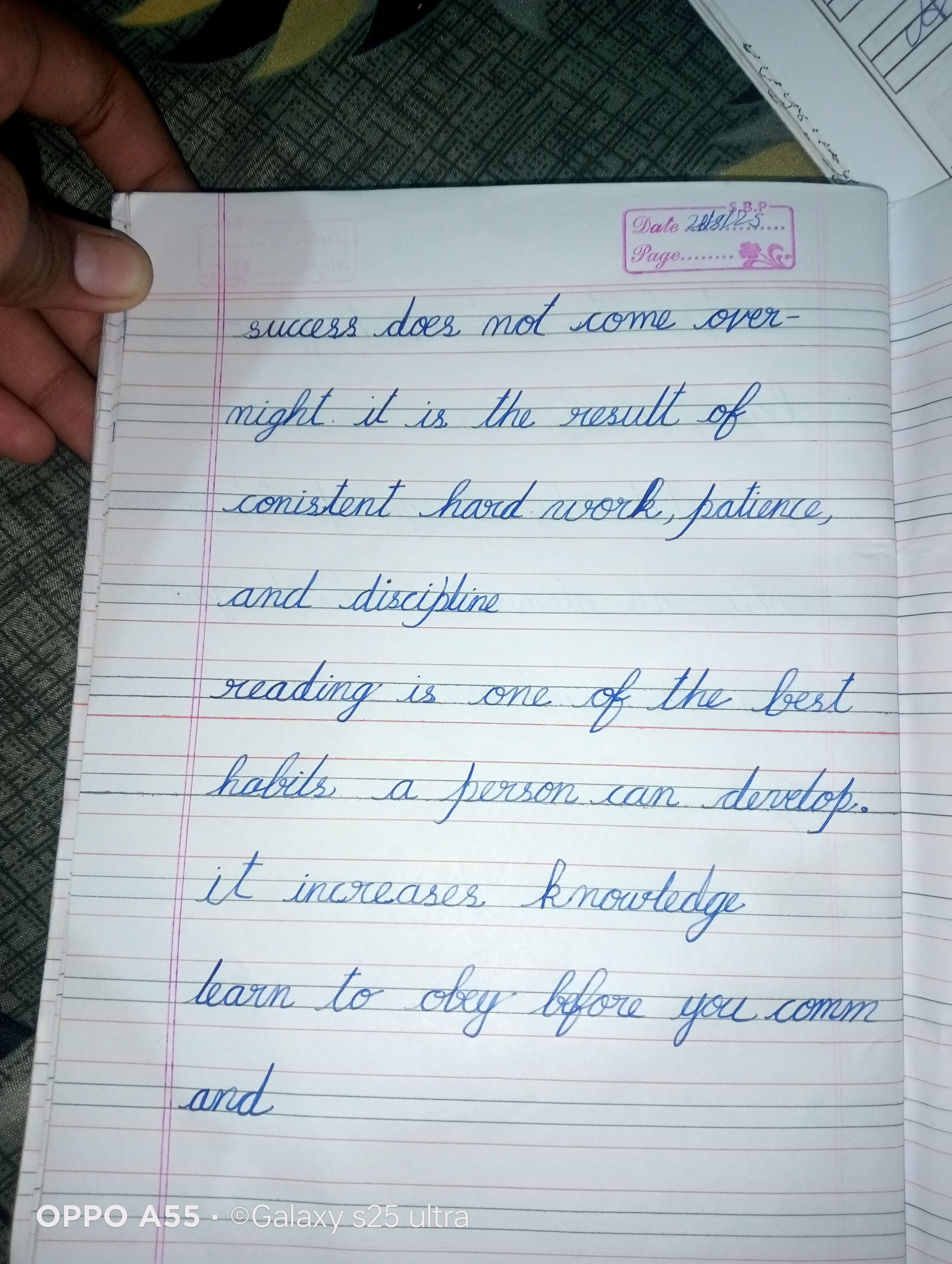 Based on this sample, the writer may possess traits such as conscientiousness, thoughtfulness, and a degree of introversion. The neatness and organization of the writing suggest someone who values order and precision. The careful letter formation indicates a person who is attentive to detail and takes pride in their work. There's a sense of control and restraint, suggesting a composed and level-headed individual. The choice of words further reinforces the idea of someone who values hard work and self-improvement.