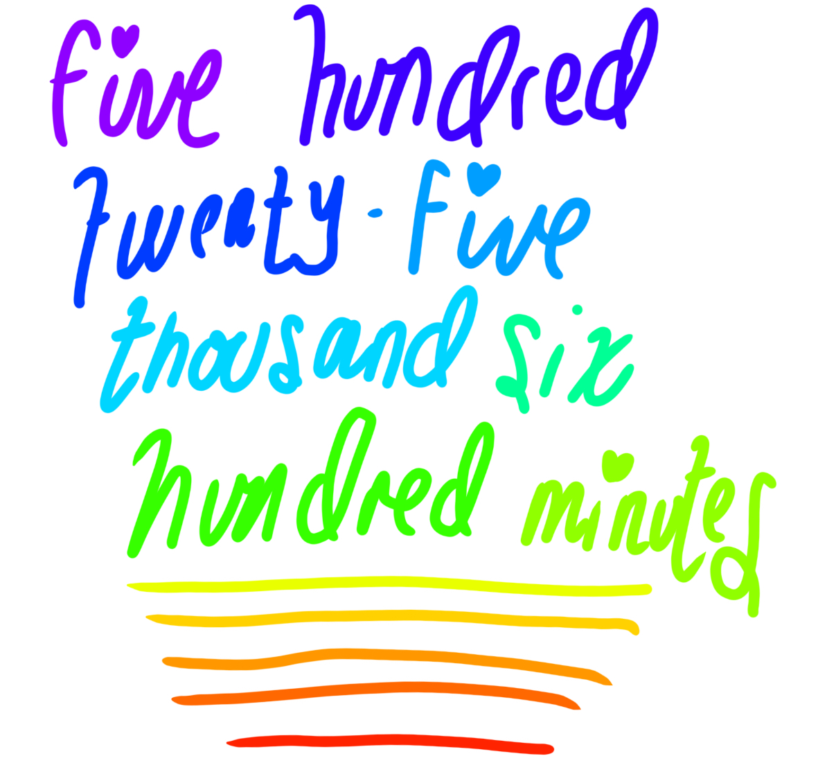 This handwriting presents a playful and artistic style, evident in the rounded forms of letters like the 'o' in "hundred" and the slightly exaggerated curves in words like "five" and "minutes". The size variation between the words adds a touch of whimsy, and the decorative hearts above some letters contribute to the overall impression of creativity and fun. The consistent spacing between letters and words lends a sense of openness and clarity, though the varying stroke thickness introduces some visual texture. The lines at the bottom, coloured like a rainbow, are a bold design element.