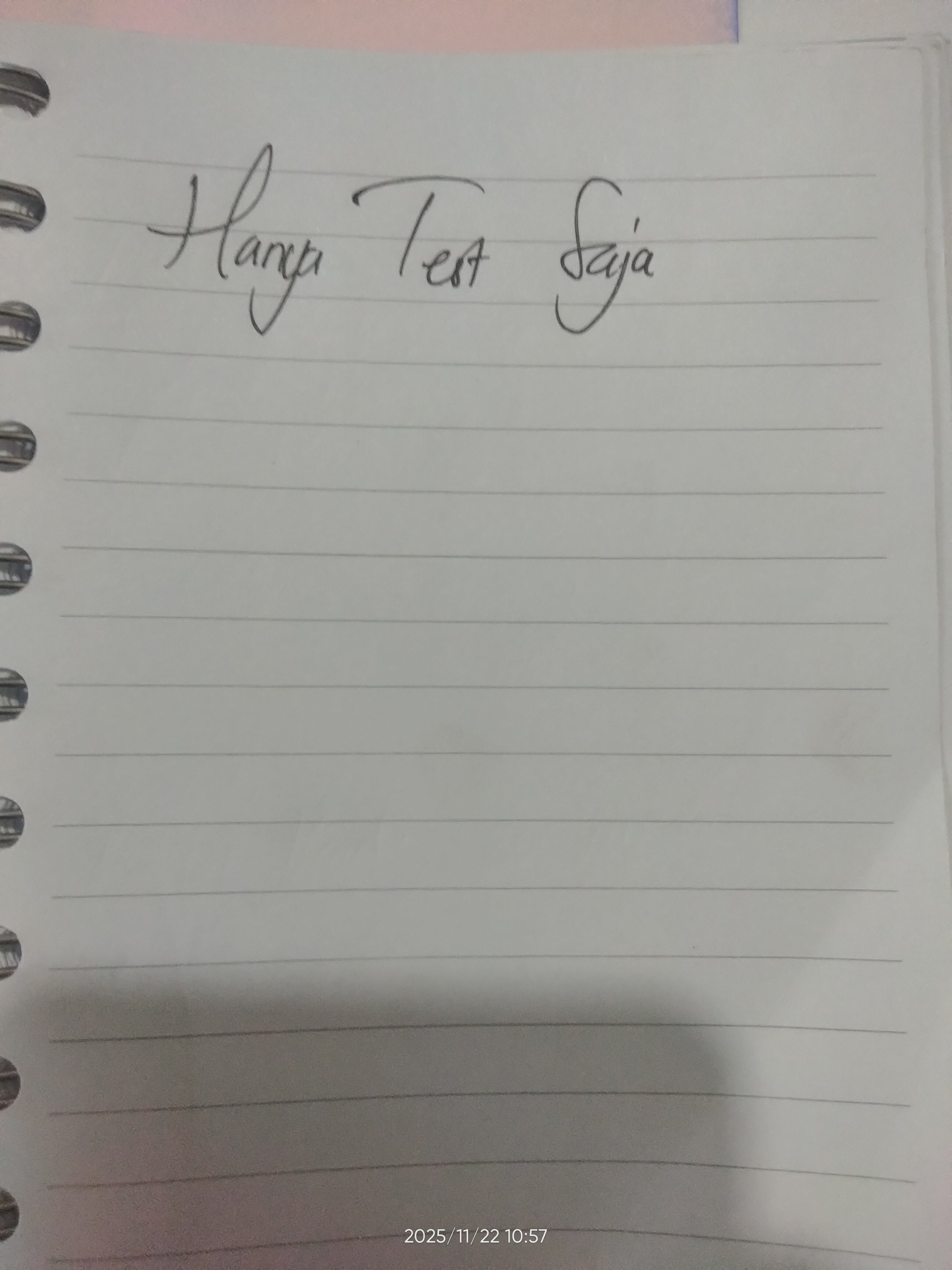 The handwriting presents a flowing, cursive style, evident in the connected letters of "Hanya Test Saja". The strokes are generally rounded, and there's a noticeable upward slant to the writing. The size is moderate, and the spacing between words is comfortable. While the overall appearance is neat, there's a slight inconsistency in the formation of certain letters, such as the 'a' which varies slightly in each word.