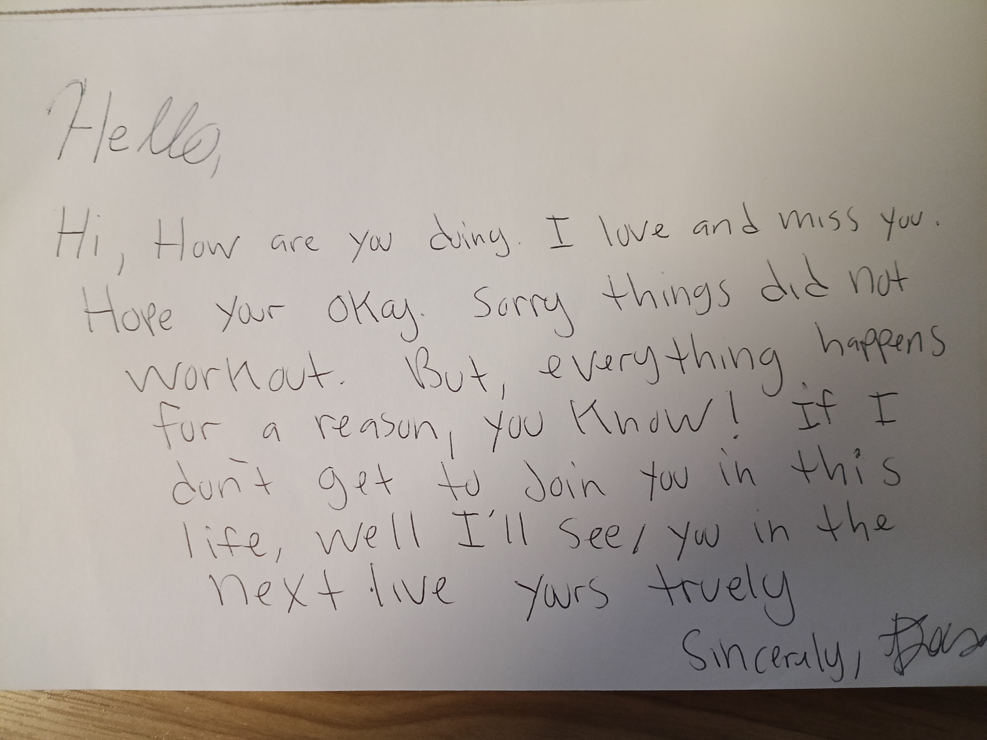 This handwriting suggests an empathetic and expressive personality. The writer appears to be someone who values connection and relationships, as indicated by the affectionate message and the open, rounded letterforms. There is a sense of optimism and acceptance, shown by the phrase "everything happens fur a reason, you know!". While not overly precise, the handwriting conveys sincerity and a genuine desire to connect with the recipient.